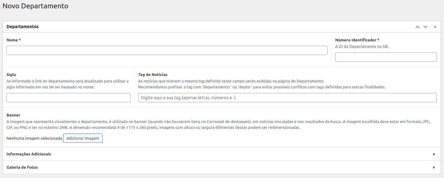 Abaixo, você poderá adicionar uma foto ou imagem do Departamento, clicando em “Adicionar imagem”. Esta imagem será utilizada nas páginas do Departamento e em notícias vinculadas (mais informações nas seções a seguir). Atente-se para os formatos e as dimensões que recomendamos.