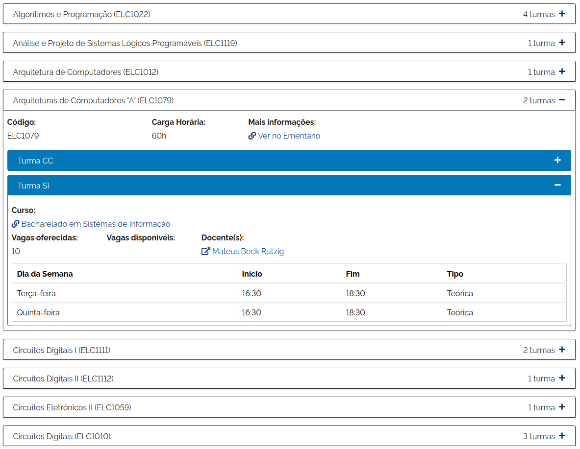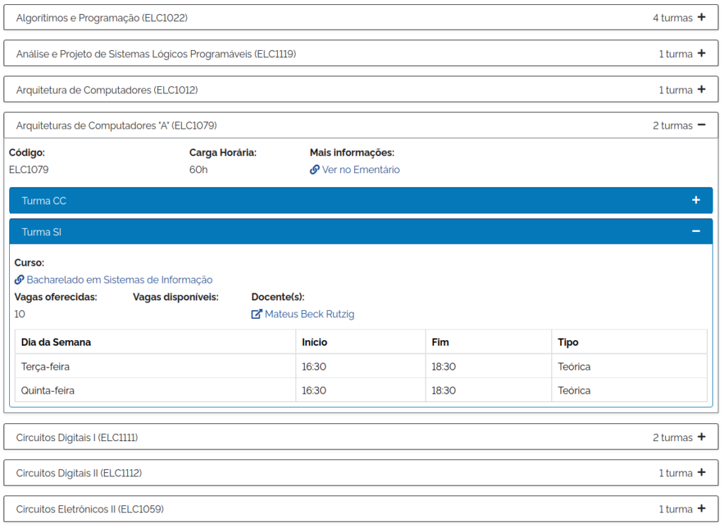 Esta página traz a oferta atual de turmas de disciplinas do Departamento, sendo as informações apresentadas de forma semelhante à busca de disciplinas em oferta: cada item apresentado informa a disciplina, a quantidade de turmas e para cada turma é informado a lista de docentes, os horários e em qual curso ela está sendo ofertada.