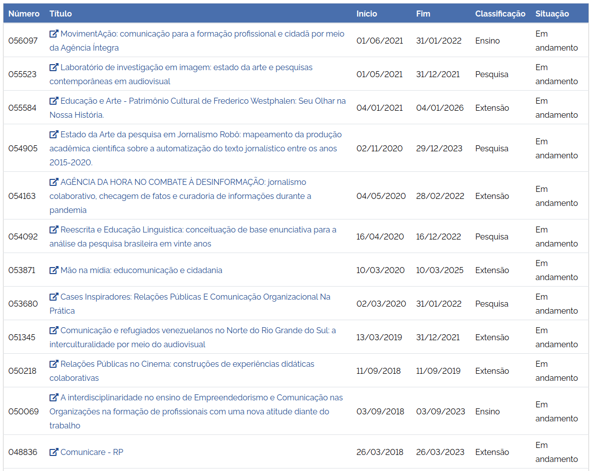 A apresentação dos dados informa sobre o projeto: o número do projeto; seu título; as datas de início e fim; a classificação; e a situação. O título do projeto possui um link que permite ao visitante verificar as demais informações no Portal de Projetos, uma importante ferramenta de controle e transparência pública para a instituição.