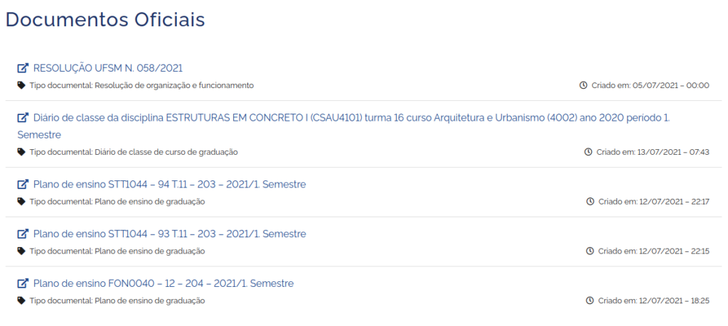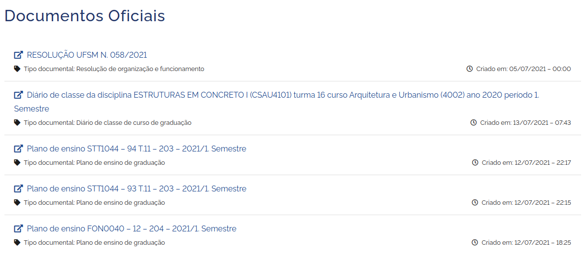 Como forma de facilitar a divulgação de Documentos Oficiais relacionados ao departamento, é possível cadastrar uma lista de documentos presentes diretamente no SIE. Esta lista será exibida em uma página específica identificada como “Documentos Oficiais” no menu de páginas acima do cabeçalho.