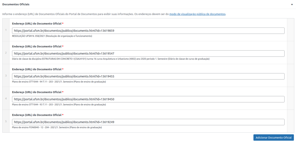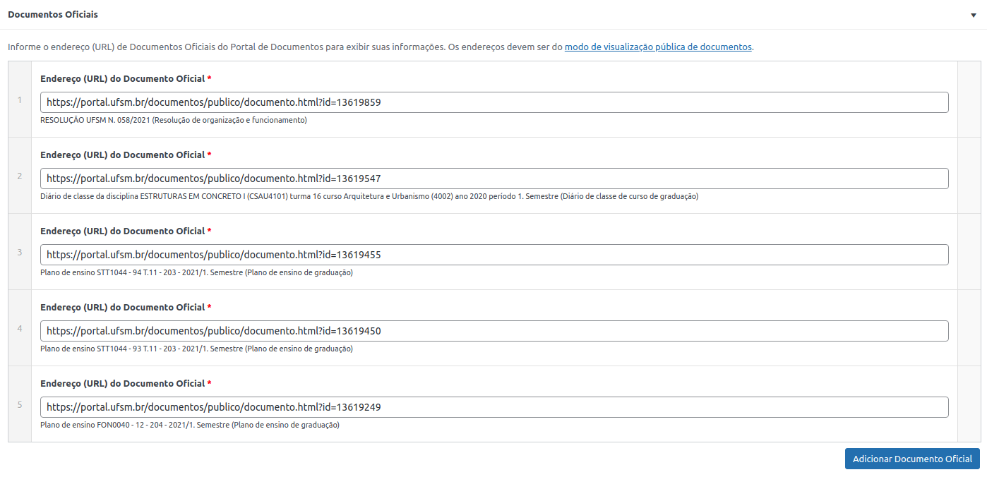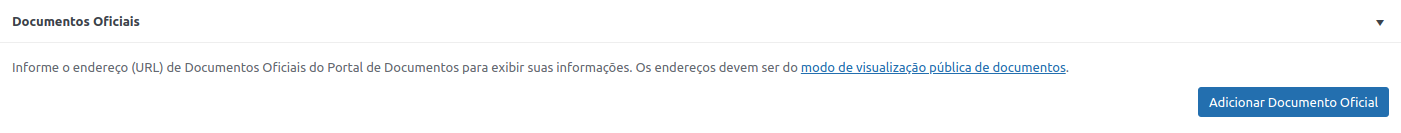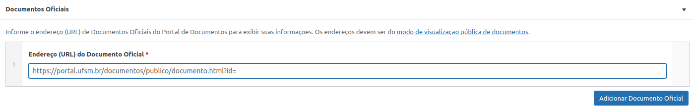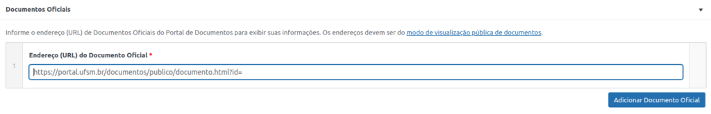 Ao clicar no botão “Adicionar Documento Oficial”, será adicionado um novo item na lista que conterá um campo que recebe um único argumento: o endereço público do documento oficial. Este endereço pode ser obtido através da pesquisa pública de documentos, presente no Portal de Documentos.