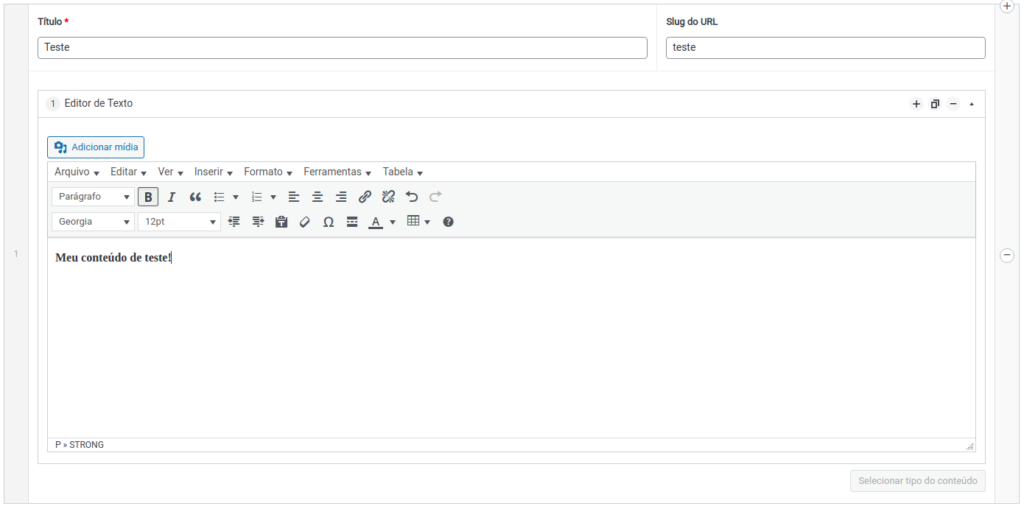 Para adicionar conteúdos diversos à uma página, basta clicar no botão “Selecionar tipo de conteúdo” e selecionar a opção “Editor de Texto”, conforme mostrado na imagem ao lado.
