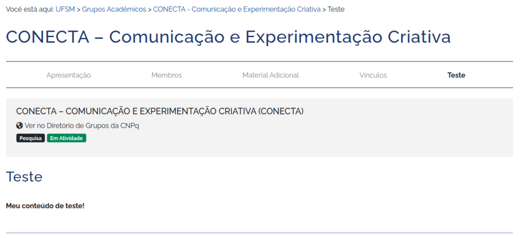 - deve-se evitar a divulgação de conteúdo atendidos pelo formulário principal, como: Notícias, Linhas de Pesquisa (para Grupos Acadêmicos) e Documentos Oficiais (para Departamentos). Utilize o cadastro adequado para estes fins;