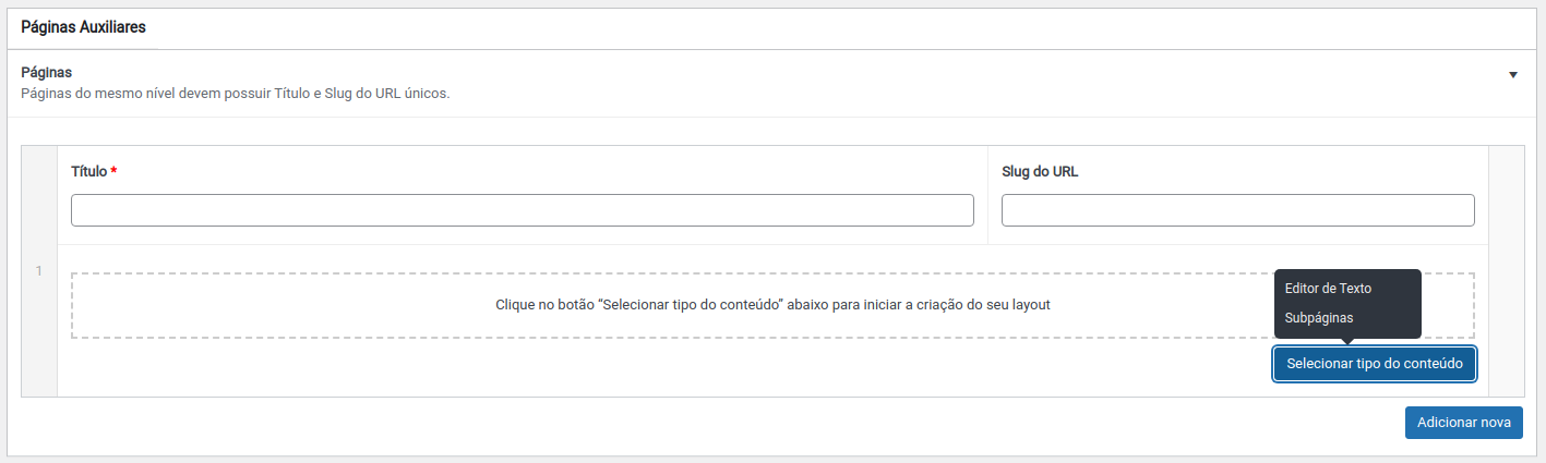 - Slug do URL: o trecho que identifica a página no endereço, deve ser único entre as páginas do mesmo nível. Como é opcional, se não for informado será gerado a partir do título;