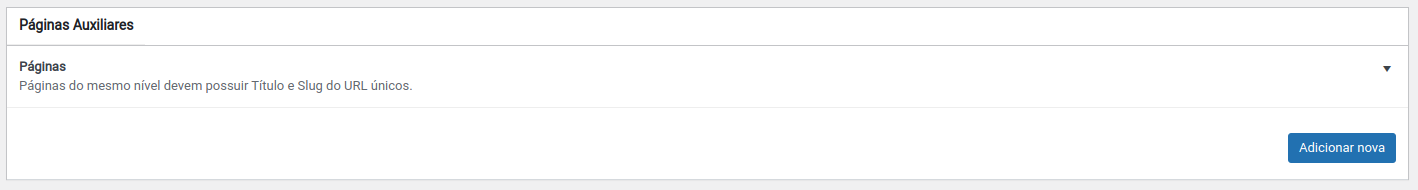 O primeiro passo para adicionar uma nova página auxiliar é localizar a seção “Páginas Auxiliares”, localizada logo após o formulário de cadastro principal. Esta seção possui uma única subseção chamada “Páginas” com algumas instruções de uso, basta clicar sobre ela para revelar as páginas já cadastradas e a opção de “Adicionar nova”, identificada pelo botão em azul na imagem a seguir.