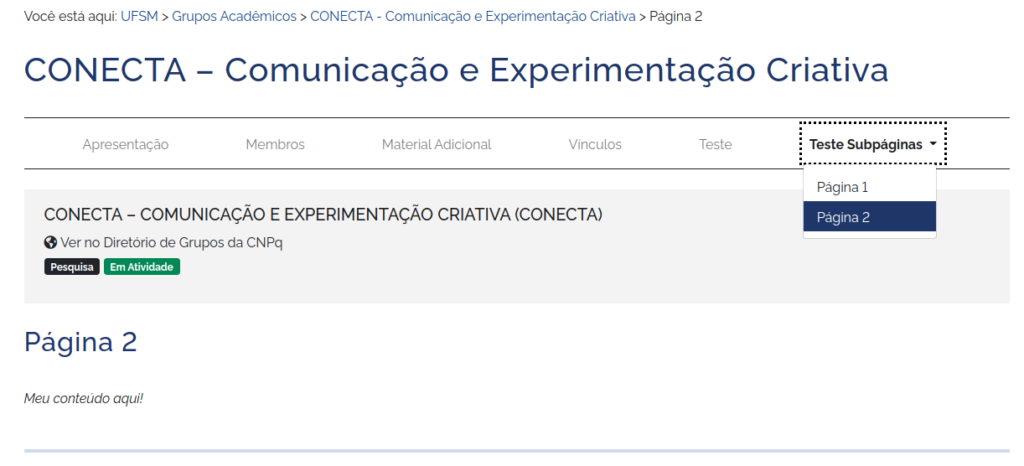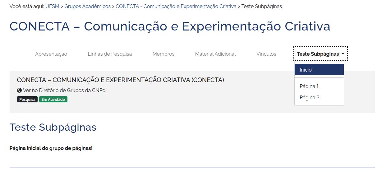 Estes itens serão exibidos no menu, após os outros itens, porém estarão agrupados em um item próprio. Este item estará identificado com o título definido no item superior às subpáginas, no exemplo acima identificado pelo título “Teste Subpáginas”.