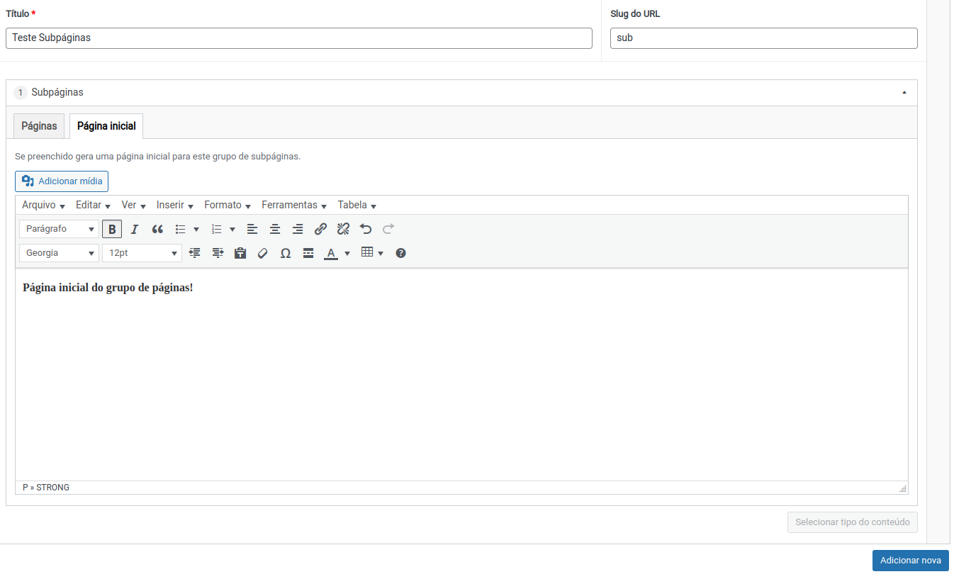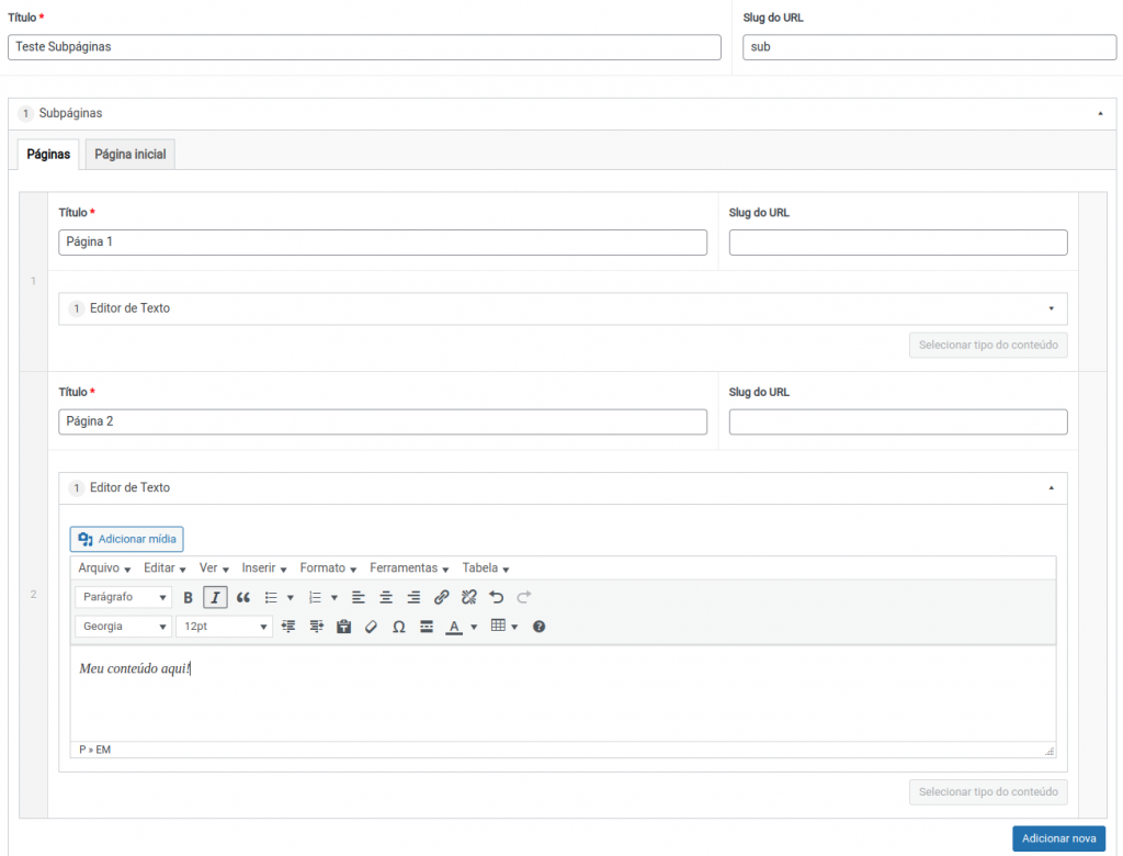 Ao clicar nesta opção um campo “Subpáginas” será exibida no espaço antes vazio, basta inserir o conteúdo desejado.
