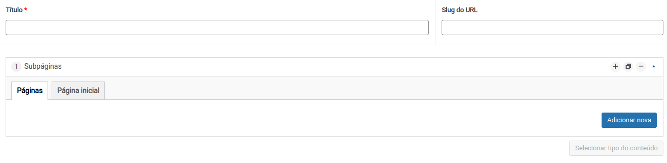 Para adicionar Subpáginas (um grupo de páginas), basta clicar no botão “Selecionar tipo de conteúdo” e selecionar a opção “Subpáginas”, conforme mostrado na imagem ao lado.