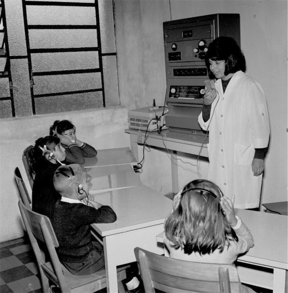 Audiodescrição da imagem: Fotografia em preto e branco e formato paisagem de um ambiente interno com uma mulher em pé segurando um microfone em frente a quatro crianças em carteiras escolares, com fones de ouvido supra-auriculares. Ao centro, vê-se o canto da sala com uma mesa retangular à direita, com aproximadamente um metro de largura, e sobre ela dois equipamentos de som. O primeiro equipamento é quadrado, baixo, claro e tem um fio curto ligado ao microfone. O segundo é retangular, alto, escuro e tem botões claros. A mulher, à direita, tem pele clara, cabelos pretos com corte chanel e franja, e veste jaleco branco, longo, abotoado, de meia manga, sobre uma blusa escura. As crianças, três meninos e uma menina, têm pele clara e estão sentadas, lado a lado, em perspectiva, com as carteiras levemente em curva sobre as quais apóiam os cotovelos. À esquerda, o primeiro menino com cabelos escuros, testa franzida e mãos em forma de concha sobre os fones. Ao lado, o segundo, com cabelos escuros e lábios apertados. O terceiro tem cabelos claros. Eles usam cabelos curtos, roupas escuras e olham para a mulher, virados para a direita. A menina, ao lado e à direita, está de costas com as mãos sobre os fones, tem cabelo escuro na altura dos ombros, veste roupa clara e tem um foco de luz atrás de si. As paredes são claras. Na parede da esquerda, uma janela basculante alta.