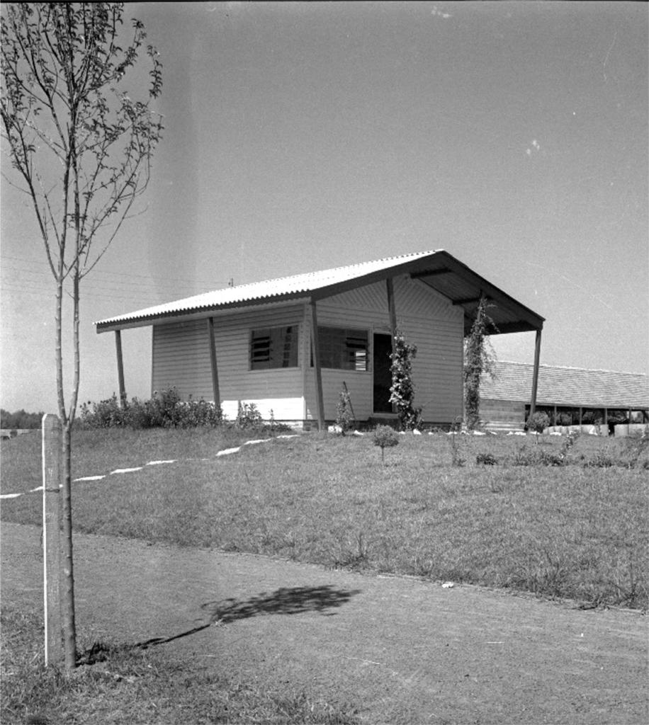 Audiodescrição da imagem: Fotografia em preto e branco, em dia ensolarado, de uma casa avarandada no alto de terreno gramado, próxima a uma estrada de terra. A casa é de madeira, na cor branca, onde se vê a lateral esquerda e a fachada. Sete escoras de madeira escura sustentam o avanço do telhado de fibrocimento e trepadeiras envolvem as duas escoras centrais. No canto da casa, duas janelas basculantes quase juntas, uma em cada parede. Na fachada, ao lado da janela, uma porta aberta. À direita, ao fundo, um grande telhado de barro sustentado por pilares cobrem embalagens altas e claras. Na lateral esquerda da foto, uma muda de árvore com tronco fino, que se divide em dois galhos que formam uma copa com poucas folhas. Atrás do tronco, cravada no gramado, uma estaca de madeira arredondada na parte superior. À direita, a estrada em diagonal descendente, na qual a sombra da árvore se estende de um lado a outro. Na subida da estrada até a casa, um caminho com degraus brancos sobre o gramado.