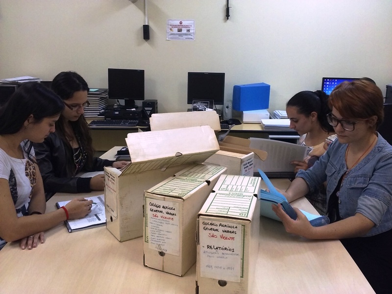 Sob a orientação da Arquivista Cristina Strohschoen dos Santos, da Divisão de Arquivo Permanente do DAG, as alunas Anelize da Silva Marcon, Catiana Ramiro da Silveira, Luiza Lisboa Inklman e Tanise Souza de Salles estão analisando as sete caixas-arquivo de massa documental acumulada do Colégio Agrícola General Vargas de São Vicente com objetivo de estabelecer o quadro de arranjo para posterior elaboração do inventário documental (instrumento de pesquisa).