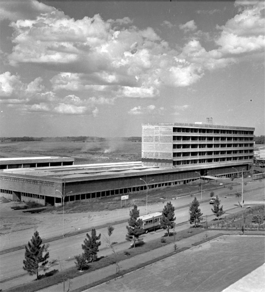 Audiodescrição da imagem: Fotografia quadrada, em preto e branco, de um prédio irregular, em construção, próximo a uma estrada de terra e uma avenida. Ao centro, visto de cima e da esquerda, o prédio com dois pavimentos na metade esquerda e sete pavimentos na metade direita. Está rebaixado em relação a avenida e ocupa toda a largura da foto. A estrutura do prédio é formada por paredes de tijolos, colunas, vigas, vãos para aberturas e a cobertura da parte baixa. O primeiro pavimento tem paredes na metade inferior e aberturas quadradas, lado a lado, na lateral e na fachada. Na lateral, há ainda três aberturas verticais largas da altura do pavimento. O segundo pavimento tem paredes mais altas que a dos outros andares com aberturas pequenas, lado a lado, na parte superior. Na fachada, próximo ao centro, há uma grande abertura com acesso a uma rampa larga. Na metade baixa do prédio, a cobertura é similar a fileiras de pirâmides. Na metade alta, os outros cinco pavimentos são idênticos, com paredes maciças nas laterais e aberturas, lado a lado, na parte superior. À frente do prédio, um gramado em aclive que inicia abaixo das aberturas do primeiro andar e finaliza na estrada de terra. A estrada contorna o prédio e forma um aclive da lateral para a fachada. Entre a estrada e a avenida, um canteiro com postes de luminárias duplas, arqueadas, uma para cada lado. Na avenida, um canteiro central com pinheiros entre duas calçadas, um ônibus e uma caminhonete. Ao fundo, céu com nuvens escuras, campo com pequenos focos de fumaça e parte superior de outro prédio baixo, à esquerda.
