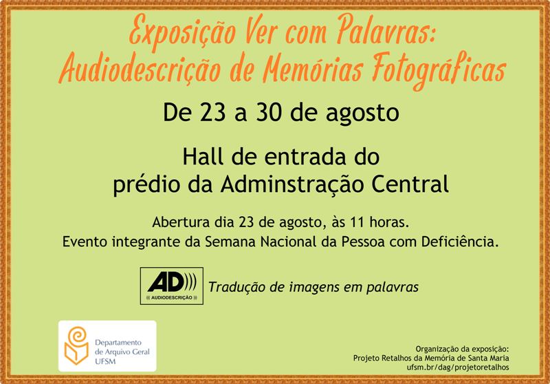 De 23 a 30 de agosto estará aberta ao público, no hall de entrada da Reitoria (prédio 47 – Administração Central) a Exposição Ver com Palavras: Audiodescrição de Memórias Fotográficas. A exposição exibirá 12 fotografias do Arquivo Fotográfico da UFSM audiodescritas. O objetivo é ler o texto (a audiodescrição) e imaginar a fotografia e depois visualizar a imagem. As fotos estarão acompanhadas de textos braille, serviço este realizado pelo Núcleo de Acessibilidade.