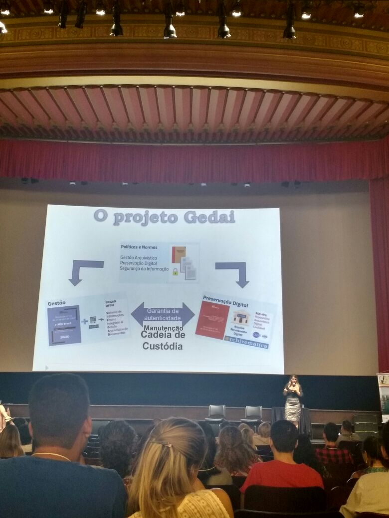 Durante o Congresso, aconteceu a Plenária: “Governo Eletrônico: políticas, ações, transações e interoperabilidade”, em que a Arquivista da Comissão Gedai Débora Flores participou como painelista juntamente com a Presidente da Câmara Técnica de Documentos Eletrônicos Claudia Lacombe. Em sua fala, a Arquivista Débora explanou sobre as ações de Informatização da Gestão, preservação e acesso aos documentos digitais que estão ocorrendo na UFSM, pontuando, com ilustrações práticas no SIE, os debates teóricos tecidos durante o evento.