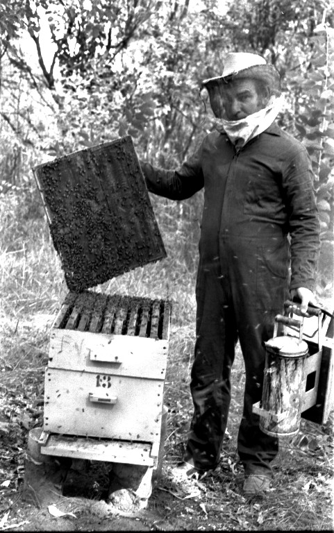 Audiodescrição da imagem: Fotografia vertical em preto e branco de um homem, de corpo inteiro, segurando um fumigador e a tampa de uma caixa de abelhas, em um campo com arbustos ao fundo. O homem, à direita, está de perfil esquerdo, tem cabelo curto, claro e liso e um chapéu de palha de abas largas sobre a cabeça. Encobrindo o chapéu e o rosto, uma proteção de tecido transparente, que na altura do pescoço é claro e grosso. O homem veste um macacão escuro de manga longa e calçados fechados e escuros. Na mão esquerda segura, pela alça, um fumigador, de metal, e na mão direita, a tampa de uma caixa, de madeira, com muitas abelhas pousadas. A caixa, à esquerda da foto e abaixo da tampa, é constituída por dois compartimentos sobrepostos com puxadores na parte frontal, e está apoiada em duas latas pequenas de metal. O compartimento de cima é uma melgueira. No compartimento de baixo está uma colméia e tem escrito o número treze. O chão é coberto de grama e, ao fundo, arbustos pequenos, escuros e ralos.