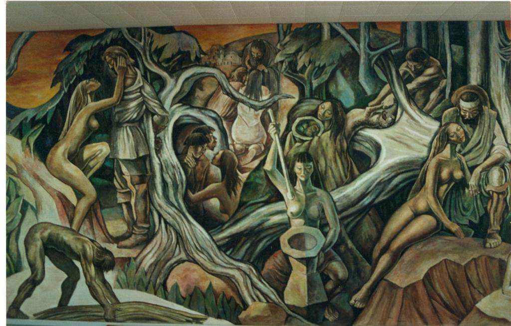 Audiodescrição da imagem: Fotografia horizontal e colorida de uma parede coberta por imagens de pessoas e de farta vegetação, feitas em traços fortes, em tons de verde e marrom. Galhos e raízes de árvores interligam as imagens. A maioria das pessoas tem características indígenas, tais como: pele parda, cabelos escuros e lisos, olhos pequenos e amendoados, corpos com musculatura definida. Na parte superior da parede, três imagens. A primeira é de uma jovem indígena com cabelos castanhos claros, magra e nua. Está de perfil direito, com o quadril apoiado em uma pedra e o rosto inclinado para cima. Toca com a mão direita o rosto de um homem que está em pé, de perfil esquerdo, com os braços para trás do corpo contornando o tronco de uma árvore. Ele tem aproximadamente quarenta anos, pele e cabelos claros na altura dos ombros, é alto e magro. Veste uma camisa branca acinturada, comprida até o quadril, uma calça branca e bota marrom claras de canos longos. Olha atentamente para o rosto da jovem indígena. Do tronco que ele contorna com os braços, saem galhos e raízes que interligam algumas outras imagens. Ao fundo, no canto superior esquerdo o pôr do sol e vegetação de folhas grandes e verdes. A segunda imagem, ao centro, é de um homem em pé e de frente, e voltados para ele, uma mulher e um homem ajoelhados. O homem em pé tem aproximadamente cinquenta anos, tem cabelo castanho escuro e curto, veste túnica marrom escura. Está levemente curvado, com a mão esquerda acima da cabeça da mulher e a mão direita apontando para o céu. A mulher tem cabelo castanho escuro e liso até o meio das costas, veste túnica rosa claro e está descalça. O homem ao lado, tem cabelo castanho claro até o pescoço e veste túnica marrom claro. Em primeiro plano um galho vindo do tronco da primeira imagem, cruza horizontalmente na altura das costas da mulher e do homem ajoelhados. Ao fundo, distante, cerca de duas casas brancas e o horizonte com o pôr do sol. Na terceira imagem, um jovem indígena, com o corpo nu e com a perna esquerda flexionada sobre um tronco de árvore que está no chão. Está curvado e segura as patas dianteiras de uma onça que está deitada com a boca aberta e o dorso neste mesmo tronco. Deste tronco, saem galhos para as laterais que interligam outras imagens. Ao redor, troncos de árvores. Abaixo, no centro da parede, mais duas imagens. A primeira é de três jovens indígenas, dois homens e uma mulher, enquadrados da cintura para cima. Os homens estão de perfil direito e um deles tem o braço sobre os ombros do outro. Em frente à eles, a mulher, de perfil esquerdo, nua, com os cabelos longos e lisos, os observa. Os homens estão de costas para o tronco da primeira imagem da parte superior da parede, de onde sai um galho que passa por cima e a direita deles. Na segunda imagem, uma jovem indígena, está em pé. Tem cabelos escuros um pouco abaixo dos ombros, rosto inclinado para a esquerda e os olhos fechados, está coberta do pescoço para baixo por uma túnica larga de cor marrom claro. As mãos também estão cobertas e seguram em frente ao rosto, uma bandeja com objetos redondos dentro. Ao fundo, o tronco com a onça deitada de dorso da terceira imagem na parte superior da parede, e dele sai, um galho que passa em frente à esta jovem indígena na altura da cintura. Na parte inferior da parede, mais três imagens. Na primeira, um homem indígena, com cerca de trinta anos, está nu, de perfil direito, curvado, com as mãos em um tronco de árvore comprido que está no chão. Ao fundo, encontro com a primeira imagem da parte superior da parede. Na segunda imagem, uma mulher indígena sentada. Está nua até a cintura e Usa um pano longo na cor marrom escuro, sobre as pernas, deixando apenas à mostra a coxa, perna e pé esquerdos. Ela é magra, tem os cabelos escuros, longos, lisos e com franja. Olha com expressão séria para uma cumbuca alta em frente à ela, que segura com a mão esquerda. Com a mão direita, segura uma colher comprida de madeira acima da cumbuca. À esquerda, raízes do tronco da primeira imagem na parte superior da parede, e ao fundo, continuação do galho que passa em frente à jovem indígena da segunda imagem no centro da parede. Na terceira imagem, uma jovem mulher indígena e um homem. A mulher está de frente, com o quadril apoiado em uma pedra grande e as pernas voltadas para a esquerda. Ela é magra, tem os cabelos longos e lisos, está nua e inclina ligeiramente o rosto para a direita, próximo ao rosto do homem. Ele tem pele clara, cabelo castanho escuro, e barba preta. Usa uma faixa branca na testa e um chapéu preso atrás da cabeça. Veste camisa branca com manga dobrada até o cotovelo, calça branca e uma manta comprida verde. Está com a perna esquerda flexionada sobre a pedra, com o antebraço esquerdo sobre a coxa e olha para baixo. Atrás deles, um galho horizontal, vindo do tronco de árvore em que a onça está deitada de dorso. Perpendicular à parede com as imagens, uma parte do teto, feito com quadrados pequenos e brancos.