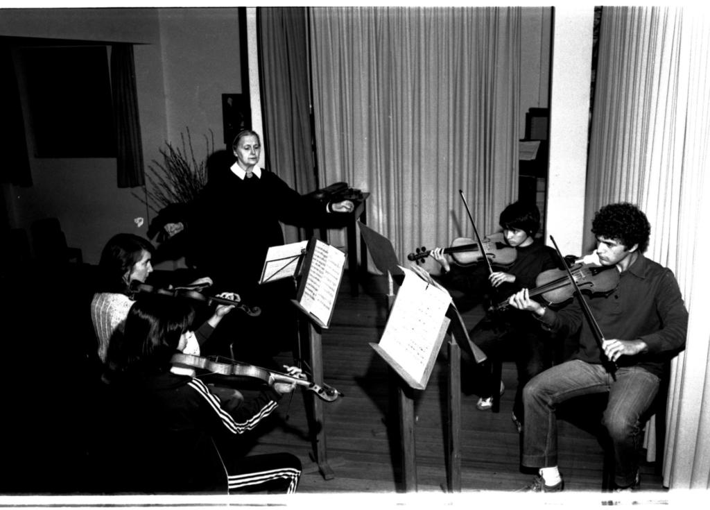 Audiodescrição da imagem: Fotografia horizontal em preto e branco de jovens violinistas sob a regência de uma freira em uma sala de aula. Os violinistas são adolescentes e estão sentados em semi-círculo: duas meninas à esquerda e dois meninos à direita. A primeira violinista tem cabelo escuro e liso e veste calça e casaco de abrigo escuro com três listras brancas nas laterais; Enquanto a outra tem cabelo curto, escuro e liso e veste blusão de lã claro. À direita, o primeiro violinista tem cabelo crespo e curto e veste moletom de gola pólo, calça jeans, meia clara e sapato mocassim escuro; enquanto o outro tem cabelo curto, escuro e liso e veste moletom escuro, calça jeans e tênis claro. Os quatro têm os violinos apoiados ao ombro direito e seguram o arco com a mão esquerda. À frente deles, quatro estantes de madeira sobre as quais estão a pauta musical. No centro e ao fundo da fotografia uma senhora, em pé, com os braços esticados e voltados para frente, e mãos erguidas e espalmadas, regendo. Ela tem pele clara, cabelos claros e veste um hábito escuro e longo, sob o qual usa camisa clara cujo colarinho, claro, tem um camafeu entre as lapelas. Á sua frente, uma estante de metal sobre a qual está a pauta musical. E atrás dela, uma mesa pequena, de madeira, com um estojo para violino. As paredes da direita e do fundo estão cobertas por cortinas claras e a da esquerda tem uma janela de madeira, fechada, com um arranjo de folhagens abaixo. O piso é de madeira escura.
