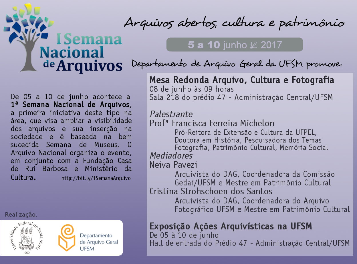 v Mesa Redonda Arquivo, Cultura e Fotografia tendo como palestrante principal Francisca Ferreira Michelon, Pró-Reitoria de Extensão e Cultura da Universidade Federal de Pelotas – dia 08 de junho as 9 horas na sala 218 do prédio da administração central UFSM