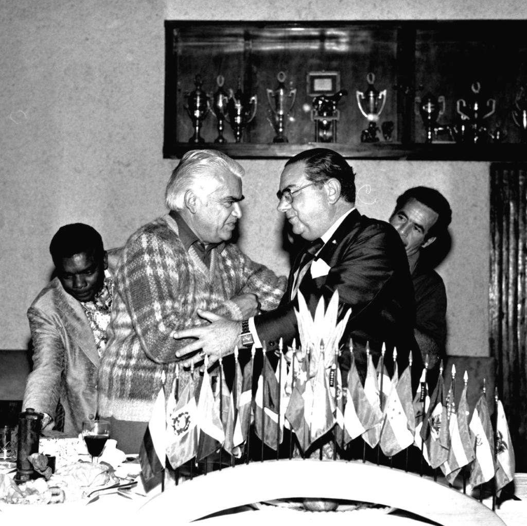 Audiodescrição da imagem: Fotografia horizontal em preto e branco de dois homens cumprimentando-se, com um aperto de mãos, atrás de uma mesa com bandeirolas. Os homens, de faixa etária de 40 anos, estão posicionados de perfil e enquadrados do tórax para cima. À esquerda, o homem tem pele clara, cabelo branco, curto e liso, veste um pulôver de lã xadrez com decote v sobre uma camisa de gola escura e está com o braço direito dobrado, cumprimentando o outro homem. À direita, o homem tem a pele clara, óculos de grau, cabelo escuro, curto e liso e veste um paletó escuro, com um lenço claro dobrado no bolso esquerdo à altura da lapela, sobre uma camisa clara e uma gravata listrada; usa um relógio quadrado no pulso esquerdo e segura com a mão esquerda o cotovelo do outro homem, cumprimentando-o. À frente deles há um suporte de madeira arqueado no qual estão fixadas vinte e quatro miniaturas de bandeiras dos países participantes do evento. Por trás desse suporte, bem no meio e em pé, há um abacaxi e, à esquerda, uma taça de vinho com líquido escuro, ambos sobre a mesa. Atrás dos homens há outros dois homens, em segundo plano. Um deles está à esquerda: tem pele escura, cabelo escuro curto e liso e veste um paletó claro sobre uma camisa de gola estampada; está inclinado à frente, com o braço direito esticado em direção a mesa. O outro está à direita: de pele clara, cabelo escuro, curto e liso, observa o cumprimento. No fundo, uma parede de tom claro, com uma estante embutida na metade superior, onde estão expostos nove troféus grandes.