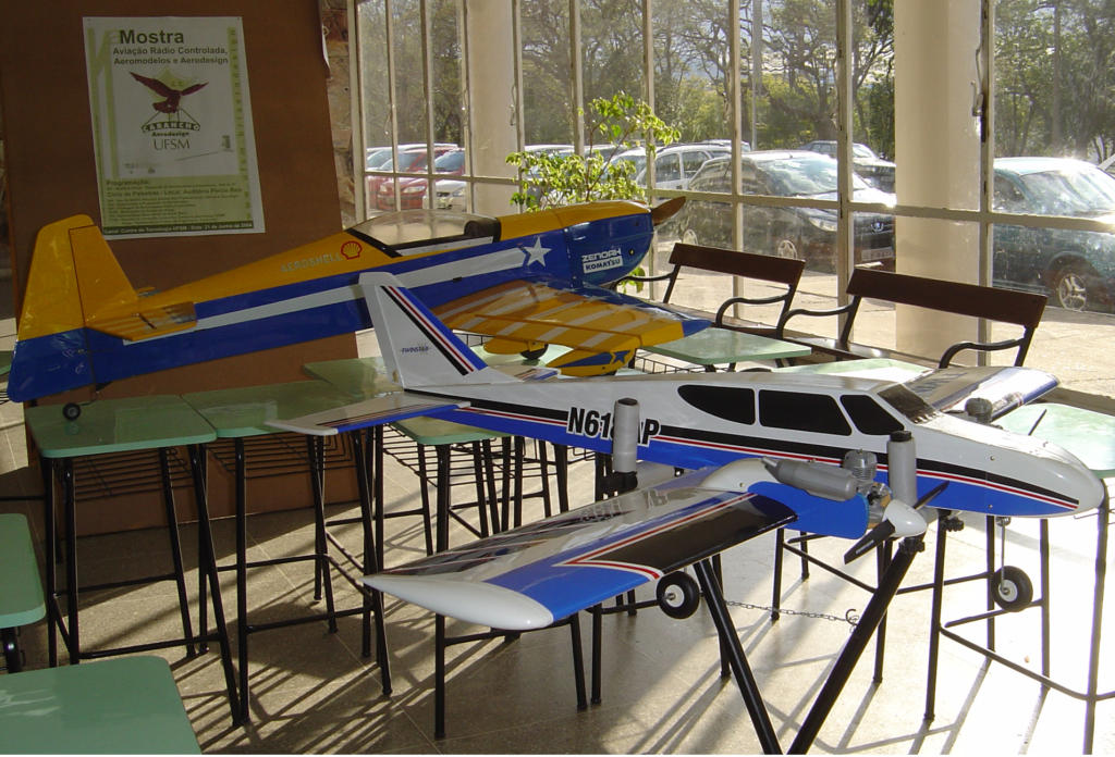 Audiodescrição da imagem: Fotografia horizontal e colorida de dois aviões, com cerca de um metro cada, expostos em um ambiente interno, semelhante a um hall de um prédio. Os aviões estão ao centro da imagem, enquadrados por inteiro, com o segundo avião situado à frente, em perpendicular ao primeiro. Do primeiro avião, à esquerda, é possível ver a lateral direita da fuselagem. Neste, há uma cabine de comando na parte superior, de vidro, em formato ovalado, sem portas laterais, com a asa projetada abaixo. A coloração da metade superior é amarela e sua metade inferior é azul, havendo sobre esta uma listra horizontal seguida de uma estrela, ambos na cor branca. Da asa, vê-se a cor azul na região anterior e a cor amarela posteriormente, com listras brancas nesta, sendo cada uma seguida pelo desenho de uma estrela branca, posicionada na intersecção entre ambas as cores. As asas posteriores da região da cauda do avião têm a mesma decoração. Contém um trem de pouso traseiro e dois dianteiros e uma hélice localizada em sua parte frontal. O avião está exposto em cima de seis classes escolares verdes claras. O segundo avião, em perpendicular, tem a região da cauda partindo da metade da primeira aeronave para a frente, onde vê-se a sua face lateral direita e frontal. Este contém três janelas nesta lateral e uma janela em sua parte frontal, onde situa-se a cabine. A metade superior é branca e a metade inferior é azul, com listras horizontais preta e vermelha que intersectam ambas as cores. Tem as duas asas, localizadas abaixo da cabine, com um trem de pouso e uma hélice em cada uma delas. E, o terceiro trem de pouso está na parte dianteira da fuselagem. As asas e a cauda têm a mesma pintura, sendo a metade anterior azul e a metade posterior branca, decorados com retângulos pretos e listras vermelha e branca. Este avião está apoiado em um pedestal. Há algumas classes ao redor, dispersas, sem nenhum objeto em cima. À esquerda e após o primeiro avião, tem-se um cartaz, colado em um pilar largo. O cartaz é branco com detalhes escritos em variações de tons verde, contendo a equipe envolvida e simbolizada com o desenho de um brasão (desenho de um pássaro com as asas abertas e uma faixa presa aos pés com a escrita “carancho aerodesign UFSM”) e também “Mostra, aviação rádio controlada, aeromodelos e aerodesign”, “programação”, “ciclo de palestras – local: auditório Pércio Reis”, “local: centro de tecnologia ufsm – data: 21 de junho de 2004”. Ao fundo da imagem, à direita, vê-se dois bancos no estilo de praça e uma folhagem com cerca de um metro e meio ao lado destes. Pelas janelas do prédio, à direita, que também servem de paredes, tem-se um estacionamento e muitas árvores. E, por conta do dia ensolarado, ao chão do hall é notável as sombras das classes, voltadas à esquerda.