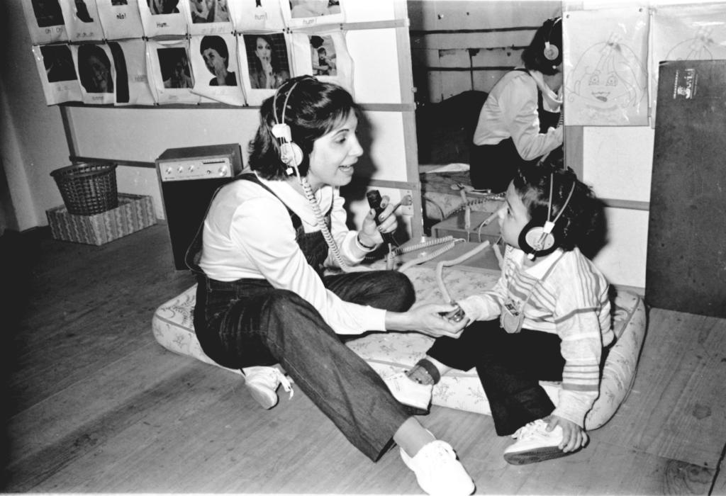 Audiodescrição da imagem: Fotografia horizontal, em preto e branco, de uma mulher e um menino, sentados de frente um para o outro em um ambiente fechado. Eles estão sentados em um chão de madeira, sobre um pequeno colchão em formato retangular, de tom claro com estampas de flores, que se situa ao centro da imagem. Estão de perfil, um de frente para o outro, e enquadrados por inteiro. A mulher, à esquerda, tem a perna esquerda cruzada por baixo da coxa direita e a perna direita voltada para frente, com o joelho dobrado e o pé para fora do colchão. Ela é magra, com a pele clara, o cabelo escuro, liso, curto e com a franja presa para trás pela alça de um fone de ouvido que faz parte de um aparelho de amplificação sonora; veste um macacão jeans, com a parte inferior tipo calça, uma camisa clara de mangas longas e um tênis claro; na mão esquerda segura um microfone pequeno, perto da boca, olhando para o menino enquanto a outra mão segura a mão direita da criança para atrair sua atenção. O menino, à direita, com faixa etária entre quatro e seis anos, pele clara, rosto redondo, a boca aberta e o olhar focado no rosto da mulher, têm cabelo escuro, levemente ondulado e curto, e também um fone de ouvido na cabeça; veste uma camisa polo em tom claro com listras horizontais e mangas compridas, além de uma calça escura e tênis claros; está sentado com as pernas abertas e ambos os pés para fora do colchão, ficando visível a meia clara com estampas no pé direito e a mão esquerda apoiada sobre o tênis do outro pé; pendurado em seu pescoço, por baixo da gola da camisa, um aparelho auditivo, alojado dentro de uma pequena bolsa de crochê; e na mão direita, um aparelho que, juntamente com os fones de ouvido e o microfone, interligam-se pelos fios, em forma de mola, até uma caixa de som pequena, situado após o colchão e na altura deste. Após esta caixa há uma parede, de tom claro, a qual se encontra um espelho, vertical, que projeta o perfil esquerdo da mulher e o restante da sala. À esquerda da imagem e junto a parede, uma lixeira semelhante a uma cesta de basquete, posta dentro de uma caixa quadrada e baixa, embrulhada em um papel estampado. Ao lado esquerdo bem próximo ao espelho e perto do chão, uma tomada com um plugue encaixado e um tipo de grade junto a parede para a colocação de folhas com imagens e palavras de expressões corporais. Às costas da mulher, no chão, uma caixa de som escura e vertical e, na parede às costas do menino, dois desenhos, ambos do rosto da mesma boneca, sendo o segundo parcialmente tapado pelo canto superior esquerdo de um painel vertical que vai até o chão.