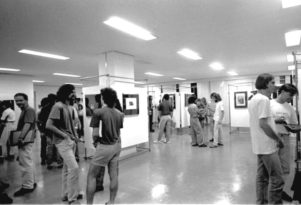 Audiodescrição da imagem: Fotografia horizontal, em preto e branco, de um grupo de aproximadamente vinte jovens em uma exposição de quadros. Todos os jovens estão enquadrados de corpo inteiro, a maioria tem pele clara, cabelos na altura do pescoço e escuros, vestem camisetas escuras, calça jeans claro e tênis escuros e alguns seguram pastas. A esquerda da imagem, um jovem de perfil esquerdo, com uma pasta em baixo do braço. À direita do jovem, outros três jovens conversam, um está de perfil direito, um está de costas e o terceiro em frente ao jovem que está de costas. O jovem de costas é o único do grupo com uma bermuda clara. A direita da imagem, dois jovens de perfil direito, um deles olha para baixo. Pelo ambiente, grupos de jovens que conversam. Dispersas pelo ambiente, pelo menos cinco estruturas de quatro lados, formadas por hastes metálicas de cerca de dois metros de altura, unidas por hastes horizontais na parte superior e inferior. Em cada lado da estrutura, um painel claro com um quadro sendo exposto. Os quadros têm fundo claro e estão em molduras escuras com vidro na frente. Uma coluna clara, atrás dos jovens que estão em primeiro plano, está rodeada por uma destas estruturas com quadros. Na parede da esquerda, mais alguns painéis com quadros e na parede da direita, cortinas claras em toda a largura. Teto claro com pelo menos quinze lâmpadas retangulares e chão com piso escuro que reflete as luzes.