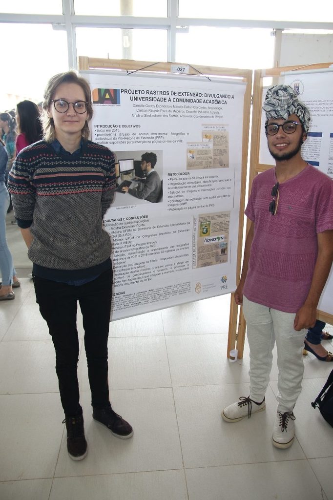 Projeto Rastros de Extensão: Divulgando a Universidade à Comunidade Acadêmica, apresentado por Danielle Godoy Espíndola (acadêmica Arquivologia) em co-autoria com Cristian Ricardo Pires Medeiros (acadêmico Desenho Industrial), Marcele Della Flora Cortes (acadêmica Arquivologia) e Cristina Strohschoen dos Santos (arquivista DAG)