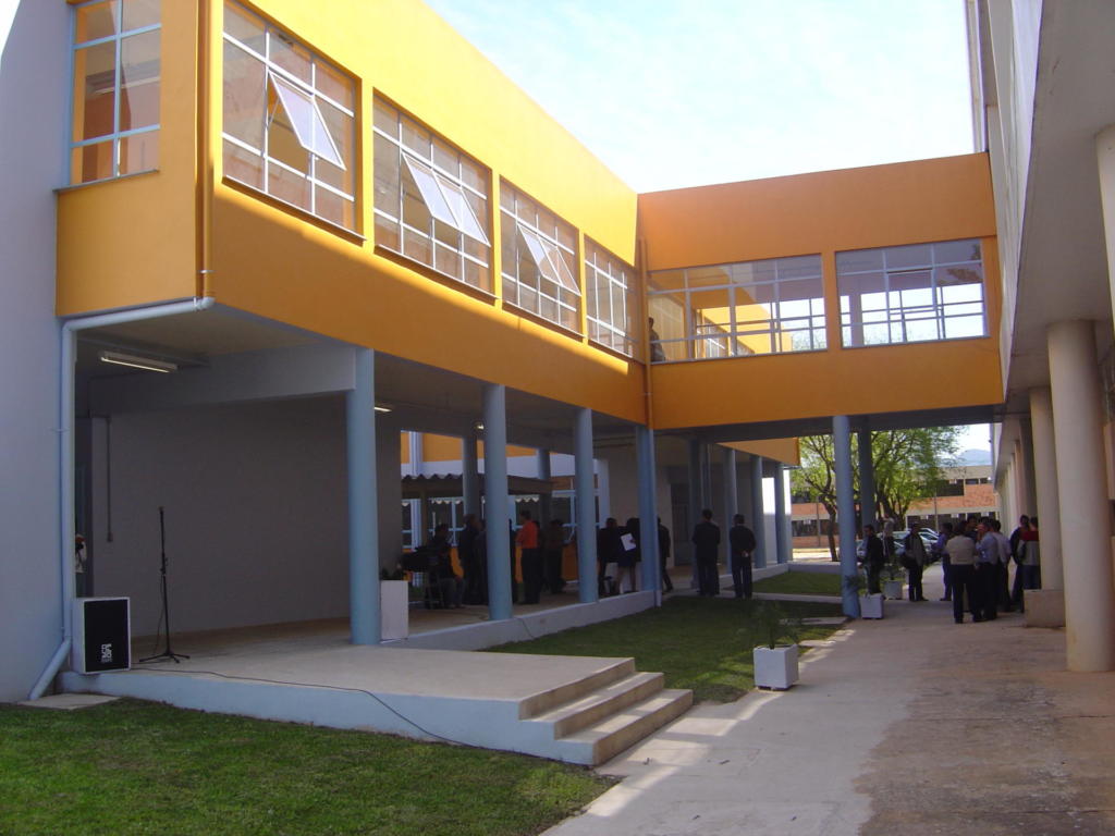 Audiodescrição da imagem: Fotografia colorida na horizontal de um prédio e muitas pessoas junto a ele. O prédio é retangular, comprido para trás, na perspectiva frontal lateral direita, com dois andares. No andar térreo, as paredes são todas brancas, tem uma área aberta, grande, e centralizada que se estende na horizontal até outro prédio, do qual aparece somente a parte traseira. Um corredor vertical, que se estende para trás, no mesmo sentido do prédio principal, contém vários pilares verticais de concreto branco. Da parte central do segundo andar, um túnel aéreo horizontal que está sobre seis pilares de concreto branco, este, dá passagem para o outro prédio. As pessoas são várias e majoritariamente homens. Estão todos enquadradas de corpo inteiro, de longe, em pé e dispersos entre a área aberta e um corredor que termina no outro prédio (este corredor está debaixo do túnel aéreo). As pessoas vestem roupas formais como: camisas, calças sociais, vestidos longos e paletós de diferentes cores e combinações. Ainda no andar térreo e no lado direito da imagem, uma parte vertical do chão é de cimento, e contém alguns pequenos vasos com plantas, as outras partes é grama verde. Ao fundo da imagem, abaixo do túnel, entre os pilares dos corredores, vê-se uma grande árvore e um terceiro prédio distante. Em primeiro plano e no lado esquerdo, um pequeno lance de escadas com três degraus, eles estão ligados a parte do chão que é de cimento e dão acesso ao corredor vertical citado acima. Na parte superior da imagem, o céu azul e ensolarado.