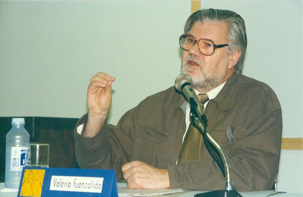 Audiodescrição da imagem: Fotografia horizontal e colorida de um homem sentado atrás de uma mesa, no interior de uma sala. O homem, na faixa etária de cinqüenta anos, está voltado levemente para a esquerda, tem cabelo e barba grisalhos, pele branca, olhos verdes, usa óculos de grau com armação redonda e marrom claro e tem a boca levemente aberta junto a um microfone; veste camisa branca com gravata dourada de tom escuro e jaqueta marrom escuro; tem o cotovelo direito apoiado sobre a mesa e a mão e os dedos unidos em posição de movimento, enquanto o braço esquerdo está deitado a frente do seu corpo, sobre a mesa. Em cima da mesa, que é branca e parcialmente visível, cinco objetos: ao centro, em frente ao homem, o microfone metálico, preso em um suporte de plástico preto; à direita, ao lado e embaixo da mão esquerda do homem, alguns papéis brancos; À esquerda, uma garrafa branca e fosca e um copo de vidro com um líquido transparente; e a frente, uma placa de mesa, horizontal, de cor azul-cobalto, na qual consta um desenho quadrado à esquerda, em amarelo, e ao lado um retângulo branco com a escrita “Valério Fuenzalida”. À esquerda do homem, junto à mesa, o encosto de uma cadeira de madeira, marrom escuro. E, ao fundo, uma parede branca com a parte esquerda e inferior de um quadro de vidro com as bordas de madeira, na cor amarelo claro.