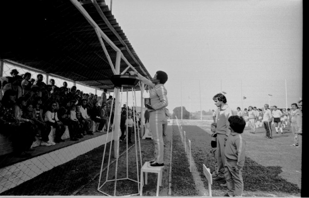 Audiodescrição da imagem: Fotografia horizontal em preto e branco de um homem acendendo uma pira olímpica, de frente para uma arquibancada repleta de pessoas, junto a um campo de futebol em um dia de céu aberto e ensolarado. Em primeiro plano, ao centro da imagem, em pé e de perfil esquerdo, um homem na faixa etária de quarenta anos, com cabelo e pele escura, vestindo jaqueta e calça clara, com listras mais claras na lateral do braço e da perna, e tênis escuro. O homem está sobre um banco quadrado e claro, segurando um pote escuro com a mão esquerda, enquanto o braço direito está esticado, com uma tocha de fogo, por cima da pira olímpica. A pira olímpica é redonda, escura e sustentada por seis canos de ferro que, no chão, formam a base em hexágono; tem altura um pouco inferior ao homem sobre o banco e está posicionada junto à lateral de um campo de futebol, de frente para a arquibancada. A esquerda da imagem e a frente do homem, parte de uma arquibancada lotada por homens, mulheres e crianças, de faixa etária entre sete e quarenta anos, sentados em quatro níveis de acentos, todos atentos ao homem na pira. A arquibancada tem a frente protegida por uma rede quadriculada, é coberta por telhas de amianto e o sol projeta sua sombra sobre o campo de futebol. As costas do homem que acende a pira, logo após as linhas de campo, outro homem na faixa etária de quarenta anos, em pé e de perfil esquerdo, com cabelo escuro e pele clara, vestindo jaqueta, calça e tênis claros. À direita dele, um menino na faixa etária de seis anos, com cabelo e pele claros, vestindo camiseta escura com uma faixa clara acima do abdômen, calça e tênis claro. Já à esquerda do homem, outro menino, na faixa etária de sete anos, com cabelo mediano e escuro, pele clara, vestindo jaqueta e calça clara com listras na lateral do braço e da perna. Entre o homem com os dois meninos e o homem que acende a pira, no segmento lateral da linha de campo, pelo menos cinco placas de propaganda, de madeira, claras, suspensas e presas no gramado por estacas, com as escritas ilegíveis. Ao fundo e quase ao centro do campo, pelo menos mais treze homens, em pé e na faixa etária de quarenta anos, assistindo o acendimento da pira; a maioria veste uniforme de futebol, com camiseta, calção e meia até a canela, em tons claros, e tênis escuro; apenas um deles veste calção escuro, além de outros dois homens com jaqueta clara, um com calça clara e outro com calça escura de listras na lateral da perna, e tênis escuros.