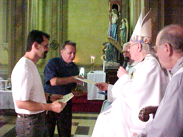 Audiodescrição da imagem: Fotografia colorida na horizontal de cinco homens no interior de um ambiente religioso. Os homens enquadrados da cintura para cima, dois de perfil direito, três de perfil esquerdo, com faixa etária de 45 a 60 anos, todos de pele branca. Dos dois homens de perfil direito: o que está em primeiro plano, tem cabelo e barba castanho escuro, sorri, veste uma camiseta branca e uma calça jeans preta, em seu punho esquerdo, um relógio preto, segura em suas mãos um papel com anotações; o outro homem, mais atrás deste primeiro, é grisalho, veste uma camisa azul escuro e uma calça social preta, com a mão direita segura um papel com anotações em direção a outro homem. Dos três homens de perfil esquerdo: todos usam óculos de grau com armação de metal, batina branca e têm cabelos brancos, o que está em primeiro plano, aparece em parte, atrás desse, outro homem, que usa uma mitra na cabeça, na mão esquerda tem um microfone em direção a boca e com a mão direita segura a ponta do papel que o outro lhe estendeu, o último, mais atrás, também aparece em parte. Ao fundo da imagem, também de perfil esquerdo, grandes esculturas de santos, uma mesa retangular ao comprido coberta por uma toalha branca com duas velas em cima. No lado esquerdo, a parte de uma outra mesa coberta por uma toalha branca e alguns objetos em cima. A parede do fundo é bege e alta, com trabalhados em relevos verticais intercalados. No chão ao fundo da imagem, um grande tapete de veludo vermelho, na parte do chão onde estão os homens, o piso é de madeira bege mesclado com madeira marrom.