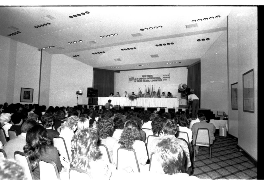 Audiodescrição da imagem: Fotografia, horizontal em preto e branco. Ambiente interno, com uma mesa retangular e comprida com 9 pessoas sentadas atrás dela. A esquerda, em um palco, as 9 pessoas, sendo sete homens e duas mulheres. A maioria dos homens tem cabelo curto, volumoso e escuro, pele clara, vestem terno e camisas claras, gravatas escuras, e alguns têm bigode. As mulheres, uma em cada extremidade da mesa, têm cabelo comprido, crespo e escuro, pele clara, vestem blusas claras de manga comprida. A frente deles, uma mesa retangular com toalha clara, que possui ao centro um arranjo de flores claras com folhas escuras, e dois microfones ocupando o restante da mesa. Na lateral esquerda do palco, há uma mesa de madeira com dois auto falantes escuros. Em primeiro plano, uma plateia sentada de costas para a imagem e de frente para a mesa com as nove pessoas. São cerca de 70 pessoas, a maioria com cabelo comprido, crespo e escuro; estão sentadas em cadeiras claras e vestem roupas claras. À frente da plateia, ao nível mais baixo, dois homens em pé, um ao centro e outro na lateral esquerda. Eles têm pele clara, cabelo curto, escuro. O homem da lateral está levemente inclinado para a frente e meche em um aparelho de projeção. Nas laterais da plateia, duas luminárias de pedestal de metal, uma em cada canto junto ao palco. Atrás das pessoas sobre o palco, um mastro com 5 bandeiras, cujas representações não é possível identificar. Já na parede, uma faixa horizontal e clara com a escrita, no centro, em letras escuras: “BEM-VINDOS, AO 1° SIMPÓSIO INTERNACIONAL, DE SAÚDE MENTAL COMUNITÁRIA” . Na lateral direita da parede “DEPTO. DE PSICOLOGIA UFSM”. Nos encontros das paredes do palco com as laterais, cortinas escuras e compridas até o chão. As paredes laterais são claras e lisas, tendo na da esquerda um quadro de arte de moldura escura e fundo escuro, enquanto na da direita, dois quadros também de moldura escura e fundo claro. O teto é claro com luminárias redondas, uma ao lado da outra, em horizontal. O chão é claro com linhas escuras formando losangos escuros.