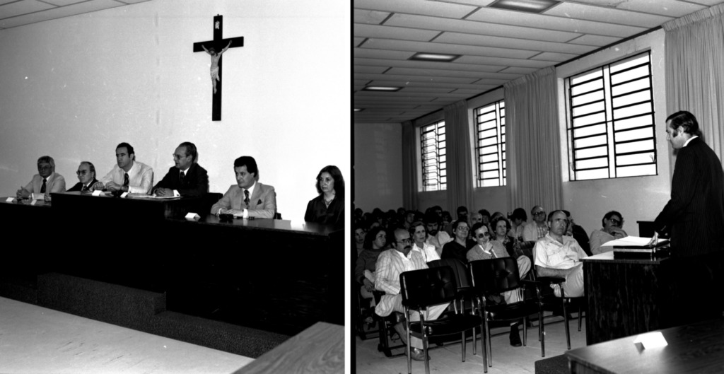 Audiodescrição da imagem: Montagem horizontal de duas fotografias horizontais em preto e branco, a da esquerda, seis pessoas, sentadas atrás de uma mesa; e a da direita um homem em pé, junto a uma mesa de frente para um público sentado. Na primeira imagem, tem cinco homens e uma mulher sentados da esquerda para à direita, um ao lado do outro com semblantes neutros; o primeiro homem tem faixa etária de 50 anos, pele escura, cabelo curto, levemente volumoso e escuro, usa óculos de grau, veste terno claro com gravata escura. O segundo homem tem faixa etária de 60 anos, pele clara, cabelo curto, liso e escuro, usa óculos, terno e gravata escuros. O terceiro homem tem faixa etária de 45 anos, pele clara, cabelo curto, crespo e escuro, e veste terno claro com gravata escura. O quarto homem têm cerca de 50 anos, pele escura, cabelo curto com entradas de calvície, liso e escuro, usa óculos de grau e veste terno com gravata escura. O quinto homem tem faixa etária de 45 anos, pele clara, cabelo curto, volumoso e escuro, e veste terno claro com gravata escura. A sexta é a mulher, com faixa etária de 45 anos, tem pele clara, cabelo comprido, liso e escuro, veste blusa escura e usa colar escuro. Sobre a mesa, na frente de cada pessoa, uma placa pequena, horizontal e clara, com a escrita ilegível. A frente deles, três mesas de madeira escura, uma ao lado da outra e sobre um tablado de carpete acinzentado. Cada mesa está com duas pessoas atrás, e a mesa do meio tem o tablado um pouco mais elevado. A parede do fundo é clara e lisa, com um crucifixo de madeira escura, com a imagem de Jesus. No canto inferior direito, a lateral de uma mesa de madeira clara. Chão de madeira laminada clara e teto claro. Na outra fotografia, um homem em pé a direita da imagem, de perfil esquerdo, enquadrado dos joelhos para cima, tem pele clara, cabelo curto, liso e escuro, e veste terno escuro. Tem a mão esquerda sobre uma mesa à frente. A mesa é de madeira escura, está sobre um tablado escuro, sobre a mesa uma pasta fechada e escura, sobre a pasta, folhas claras. Da esquerda ao centro da fotografia, cerca de 30 pessoas sentadas com semblante neutro olhando para o homem em pé. Eles têm faixa etária de 50 anos, pele clara, alguns usam óculos de grau, a maioria tem cabelo curto, volumoso e escuro. Os homens vestem camisas e calças claras, a maioria das mulheres, veste roupas escuras. Eles estão sentados em cadeiras de metal com estofado escuro, na primeira fileira, as duas primeiras cadeiras estão vazias. No canto inferior direito, a lateral de uma mesa de madeira escura. A parede da direita tem três janelas basculantes, entre as janelas cortinas claras. Teto claro com detalhes escuros na horizontal e vertical, formando compridos retângulos. Chão claro.