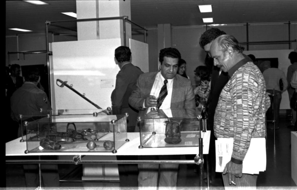 Audiodescrição da imagem: Fotografia, horizontal, em preto e branco. Três homens observando um objeto sobre uma mesa, e outras pessoas em volta em um ambiente interno. Ao centro da imagem, um homem de frente, em pé, enquadrado dos joelhos para cima. Tem pele clara, cabelo curto, crespo e escuro. Está com o rosto levemente inclinado para baixo observando o objeto. Veste terno e calça acinzentados, camisa clara e gravata escura. Em sua mão direita, segura uma taça transparente com um líquido escuro. A direita, dois homens de perfil para a esquerda, um ao lado do outro. A frente um homem de pele clara, cabelo curto com entrada de calvície, liso e escuro, e bigode escuro. Veste uma blusa com estampa de fundo claro com listras escuras e calça acinzentada. Em sua mão esquerda segura folhas de ofício e entre dois dedos segura um cigarro. Após ele, um homem de pele clara, cabelo curto, crespo e escuro. Veste terno escuro e segura na mão direita uma taça transparente com um líquido escuro. A frente deles, uma mesa de metal com tampo de madeira clara. Sobre ela três caixas de vidro retangulares. A primeira caixa a direita, tem um estribo e a representação de uma cuia logo atrás do estribo. Na caixa ao lado esquerdo, tem uma boleadeira, e atrás tem uma caixa com duas esporas. A esquerda do homem e após a mesa, um pilar claro, com uma estrutura de quatro lados, formadas por hastes metálicas de cerca de dois metros de altura, unidas por hastes horizontais na parte superior e inferior. Em cada lado da estrutura um painel claro. No painel da frente uma espada escura. Próximos a estrutura, estão dois homens, virados de costas com cabelo liso, curto e escuro e roupas escuras. No restante do ambiente, outras estruturas de ferro ao fundo da imagem e cerca de dez pessoas em pé. A parede do fundo tem persianas claras. O teto é claro com luminárias retangulares na vertical. O chão é escuro.