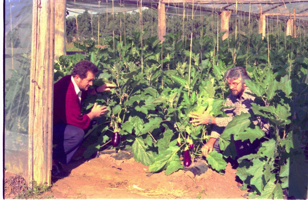 Audiodescrição da imagem: Fotografia colorida, na horizontal, de dois homens junto a uma plantação de berinjela no interior de uma estufa. Os dois homens estão em destaque, agachados e de perfil, de frente um para o outro, ambos de pele branca e idade entre trinta e quarenta anos. O homem da esquerda tem cabelo castanho escuro, veste uma blusa de cor bordô, com o colarinho de uma camisa cor branca a mostra, uma calça social cor azul marinho e sapato social preto. O homem à direita tem cabelo e barba grisalhos, usa óculos de grau com armação redonda de metal, uma camisa xadrez cor amarela e uma calça social cor cinza; e em seu punho esquerdo tem um relógio de metal. Ao redor deles, a plantação de berinjela, cujas plantas tem cerca de um metro de altura, caules semi lenhosos, folhas grandes de forma oval e inúmeros galhos laterais onde estão penduradas duas berinjelas, junto aos homens. À frente da foto, o chão, de terra vermelha e arenosa, e no lado esquerdo, um pilar da estrutura da estufa. A estufa tem cerca de três metros de altura e cinquenta metros de comprimento e constitui-se de pilares e vigas, de madeira, cobertas por plásticos transparentes na parte superior e no fundo. Após a estufa, visível através do plástico transparente, muitas árvores, distantes, em vários tons de verde.