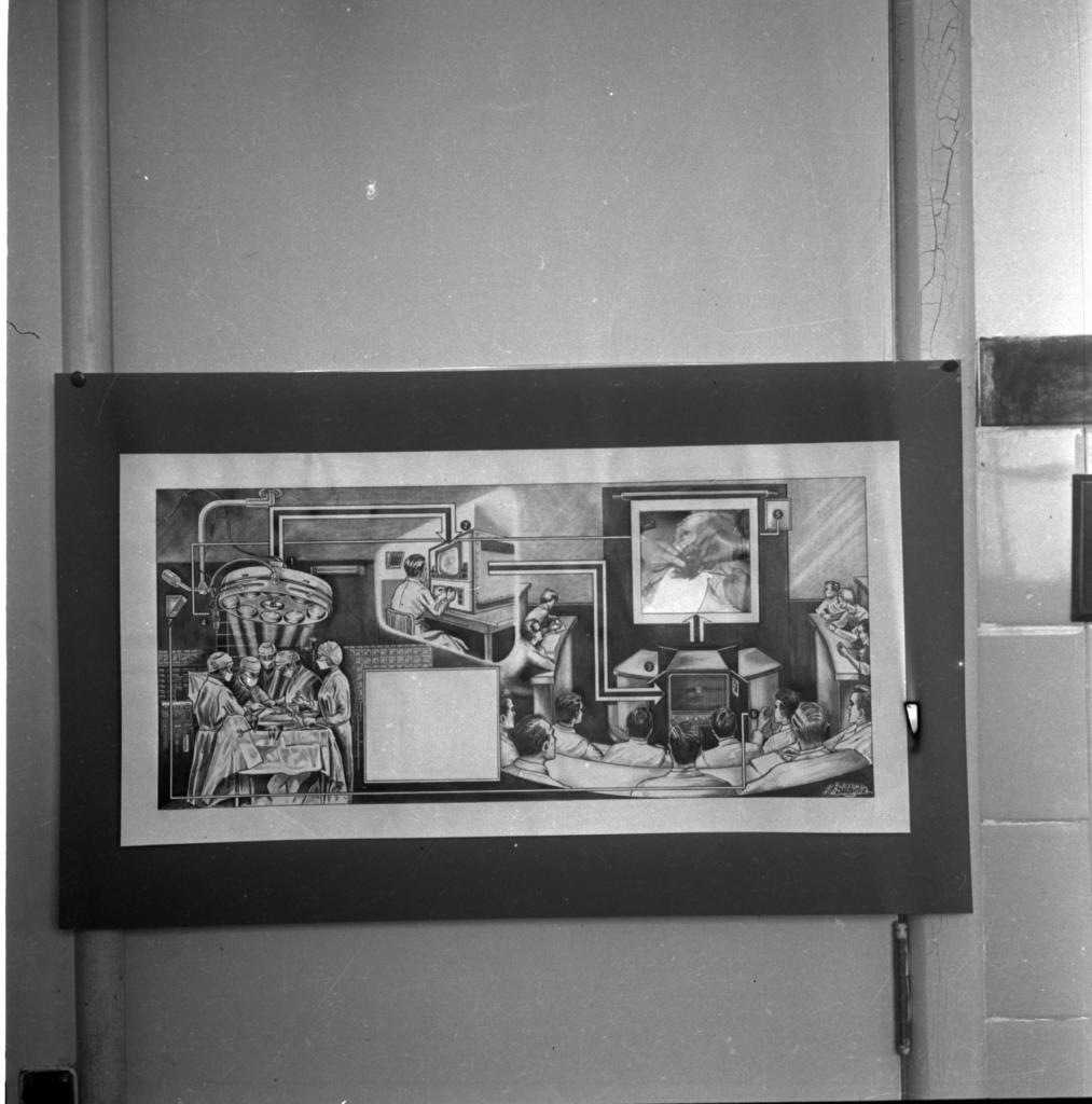 Audiodescrição da imagem: Fotografia, horizontal, em preto e branco. Um quadro com desenho ilustrando uma sala de cirurgia. O quadro tem as bordas escuras, grossas, e uma listra clara mais fina em volta de todo o quadro. Os desenhos são feitos em tons claros e escuros. Na esquerda tem cinco pessoas vestindo trajes cirúrgicos: toucas, máscaras e roupão. Elas estão em volta de uma mesa cirúrgica; acima da mesa tem uma luminária redonda. Destacado por uma claridade maior ao centro da imagem, um homem sentado, está de frente para uma televisão. A direita da imagem, doze homens sentados em formação de um U de costas para a fotografia, assistindo a cirurgia na imagem projetada em um telão. O quadro está localizado em um ambiente interno , com paredes brancas.