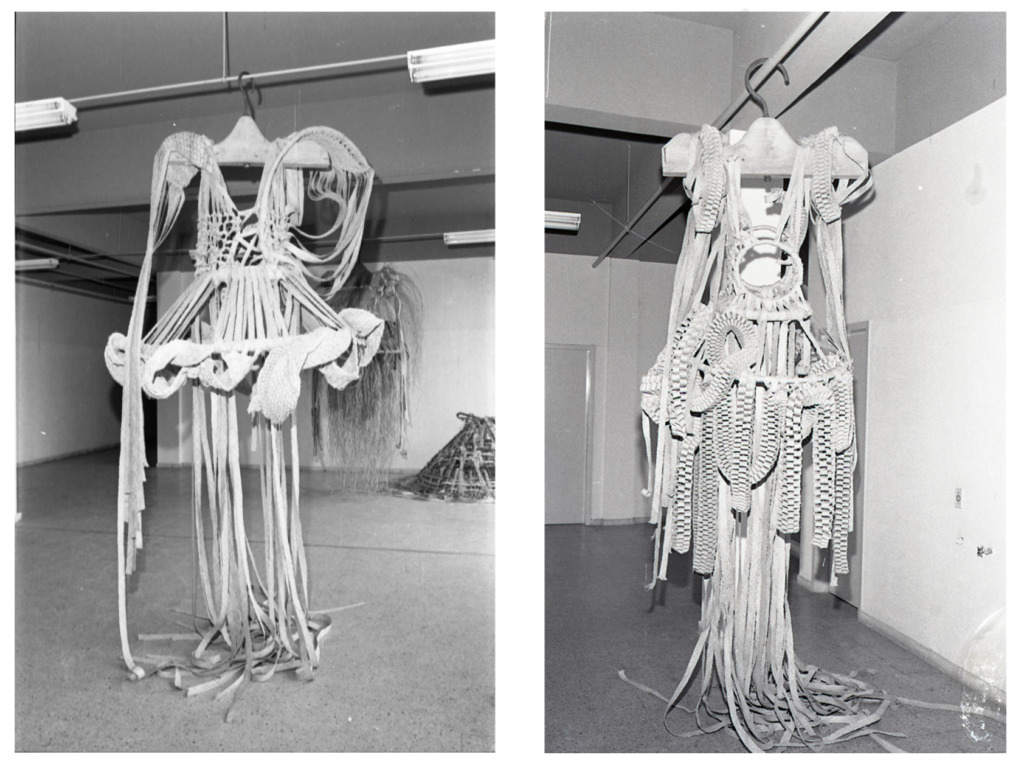 Audiodescrição da imagem: Montagem horizontal com duas fotografias verticais em preto e branco, de vestidos confeccionados à partir de fitas e tecidos de tapeçaria. A fotografia à esquerda é de um vestido de comprimento mediano, claro, com decote em “V” e com ombreiras revestidas por fitas de tapeçaria enroladas. No ombro esquerdo, algumas fitas estão soltas e vão até o chão. O corpo do vestido é vazado como uma teia. Abaixo do corpo vazado do vestido, uma saia de tiras, com algumas que vão até o chão. Na lateral esquerda, uma parede clara. Ao fundo, outra parede clara, com um vão de entrada para um corredor escuro e uma sombra de outro vestido. O teto é escuro, com retângulos vazados e lâmpadas fluorescentes próximas às paredes. O chão é claro. À direita da imagem, no chão, uma peça também feita de tecidos de tapeçaria, enrolada como um cone. Na foto à direita, outro vestido com decote mais aberto, também vazado como uma teia, longo, claro, com ombreiras revestidas por fitas largas e tecidos de tapeçaria entrelaçados. Uma grande argola revestida por tiras de tapeçaria sustenta a parte superior do tronco do vestido. A armação da saia do vestido é feita de tecidos de tapeçaria, e algumas fitas entrelaçadas com pontas que caem até o chão, formando uma longa cauda. Ao fundo, o encontro de duas paredes claras.Na parede da esquerda, uma porta clara e na parede da direita, o batente de outra porta clara atrás do vestido. Os vestidos estão em cabides de madeira, sustentados por cabos de ferro presos ao teto. O teto é escuro com retângulos vazados e lâmpadas fluorescentes próximas às paredes. Chão é claro.