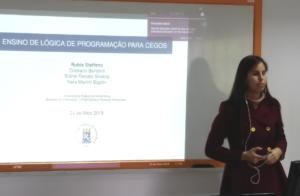 Na tarde de 24 de maio Cristina prestigiou as apresentações das comunicações de colegas da Comissão de Audiodescrição (CAD): Cíntia Pasa Lopes, bolsista do Núcleo de Acessibilidade da CAED e audiodescritora roteirista da CAD, com o tema Audiodescrição: Recurso de Acessibilidade e Desenvolvimento Científico, em co-autoria com Vitória Parodes Rodrigues e Cristian Evandro Sehnem; e de Rúbia Steffens, audiodescritora revisora da CAD, com o tema Ensino de Lógica de Programação para Cegos em co-autoria com Cristiano Bertolini, Sidnei Renato Silveira e Nara Martini Bigolin.