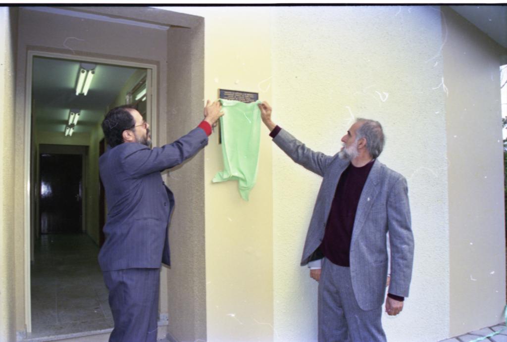 Audiodescrição da imagem: Fotografia horizontal e colorida, enquadrada levemente da esquerda para a direita, de dois homens em frente a uma parede. Os homens têm pele clara, faixa etária de 40 a 50 anos. Estão em pé e de perfil, um de frente para o outro, enquadrados do joelho para cima e com a mão direita, seguram a ponta superior de um pano verde limão, retangular na vertical e amassado nas pontas inferiores, que encobre parte de uma placa de cobre. O homem da esquerda, tem cabelos lisos e barba castanho escuro. Veste um terno “Risca de giz”azul acinzentado, com o punho de uma camisa vermelha visível ao final da manga direita. O homem da direita, com o corpo levemente voltado para frente, tem cabelos e barba grisalhos. Veste terno “Risca de giz” cinza e uma blusa bordô. Atrás dos homens, uma parede bege, com a placa de bronze à esquerda. Ao lado da placa, atrás do primeiro homem, uma porta aberta com um degrau à frente, para acesso à um ambiente interno. Através da abertura vê-se um corredor estreito com paredes bejes, ao fundo do corredor uma entrada para uma sala, o teto com três lâmpadas fluorescentes e piso de granito na cor cinza mesclado com branco.