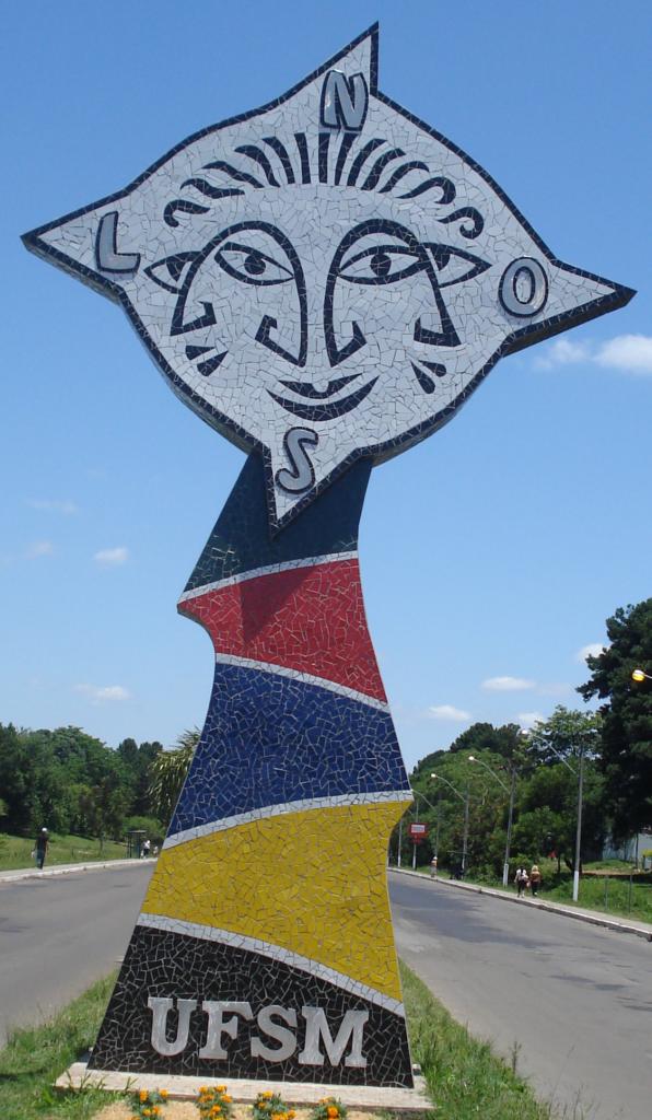 Audiodescrição da imagem: Fotografia vertical e colorida de um monumento levemente enquadrado de baixo para cima, com aproximadamente dez metros de altura, formado por um losango e uma base triangular, ambos assimétricos, e revestido em mosaico de azulejos. O losango, na parte superior do monumento, tem aproximadamente sete metros de altura e três metros de largura. Tem o fundo em azulejos brancos e é contornado por azulejos pretos. Sobre o fundo branco, o desenho de três faces humanas estilizadas, formadas por diferentes traços feitos com azulejos pretos. Na parte superior do desenho, treze traços ondulados, espiralados e retos remetem a fios de cabelos. Abaixo, as faces, uma de perfil esquerdo, uma frontal e outra de perfil direito que são formadas por traços retos e curvos, na horizontal e vertical e alguns deles fazem parte tanto da face da esquerda quanto da frontal e da face frontal quanto da direita. Avanços pontiagudos enfatizam os vértices do losango. Em cada vértice, letras em metal cinza referentes às iniciais dos pontos cardeais. “N” no vértice superior, “O” no vértice lateral esquerdo, “L” no vértice lateral direito e “S” no vértice inferior. Uma parte do lado inferior esquerdo do losango está apoiado na base triangular. A base triangular é irregular e tem aproximadamente três metros de altura e um metro de largura. É formada por cinco triângulos diferentes, nas cores vermelho, verde, azul, amarelo e preto, separados por traços de azulejos brancos. A sigla “UFSM” em letras de metal cinza está fixada no triângulo preto na parte inferior da base triangular. O monumento se encontra no canteiro central de uma avenida. O canteiro é gramado, com algumas flores amarelas em frente ao monumento. Ao fundo, as pistas da avenida e calçadas de concreto. Em ambos os lados, árvores, sendo que na calçada esquerda tem um ponto de ônibus e na da direita, postes e pessoas. Céu azul com poucas nuvens.