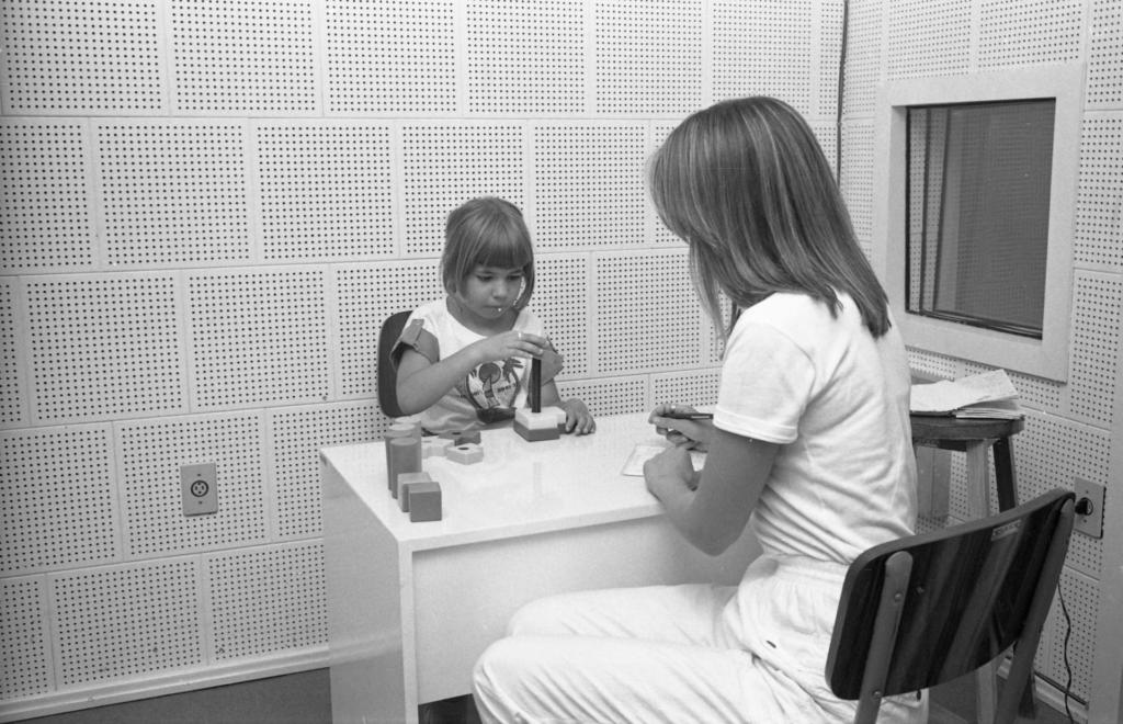 Audiodescrição da imagem: Fotografia horizontal em preto e branco de uma menina e de uma mulher junto a uma mesa em um ambiente interno. A menina está sentada atrás da mesa, de frente para nós. Tem aproximadamente nove anos, pele clara. Cabelos escuros, presos para trás, com franja e mechas caídas nas laterais, na altura do queixo. Veste blusa de tom claro, com detalhes escuros nas mangas e na parte frontal. O rosto está abaixado. Mexe em peças com diferentes formatos geométricos que estão sobre a mesa. Em frente a ela, uma mulher sentada junto à mesa, de perfil esquerdo para nós. Tem pele clara, cabelos na altura dos ombros, lisos e claros, encobrindo o rosto. Veste blusa e calça claras. Mãos sobre a mesa, segura uma caneta. Entre as mãos, sobre o tampo da mesa, uma folha de papel. A cadeira onde está sentada é de madeira com suporte de metal. A mesa é quadrada e de madeira clara. Ao lado direito da mesa, um banco de madeira, alto, com folhas em cima. Ao fundo e à direita, paredes de azulejos claros, com detalhes escuros, com rodapés claros. No encontro das paredes, um cabo de força. Na parede ao fundo, uma tomada. Na parede direita, ao centro, uma janela quadrada, de madeira clara e vidro e abaixo uma tomada com um cabo conectado. O chão é de carpete de tom escuro.