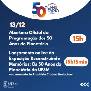 Integrou esta programação o lançamento da Exposição Reconstruindo Memórias: os 50 Anos do Planetário da UFSM, produzida pelo Departamento de Arquivo Geral (DAG) e Unidade de Comunicação Integrada, com curadoria da Arquivista Cristina Strohschoen dos Santos.