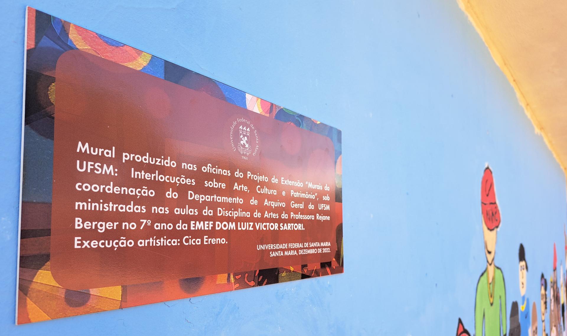 O Projeto de Extensão “Murais da UFSM: Interlocuções sobre Arte, Cultura e Patrimônio” coordenado pelo Departamento de Arquivo Geral desenvolveu, no segundo semestre de 2022, oficinas em três escolas públicas – duas municipais e uma estadual. No mês de dezembro os três murais foram inaugurados.