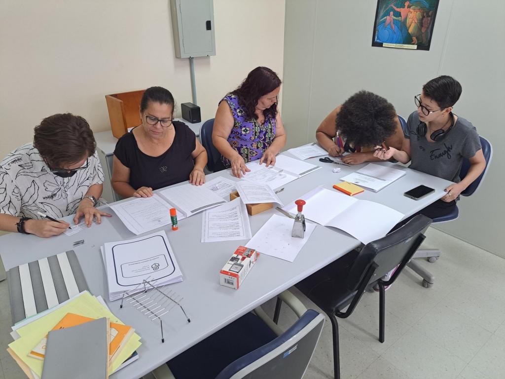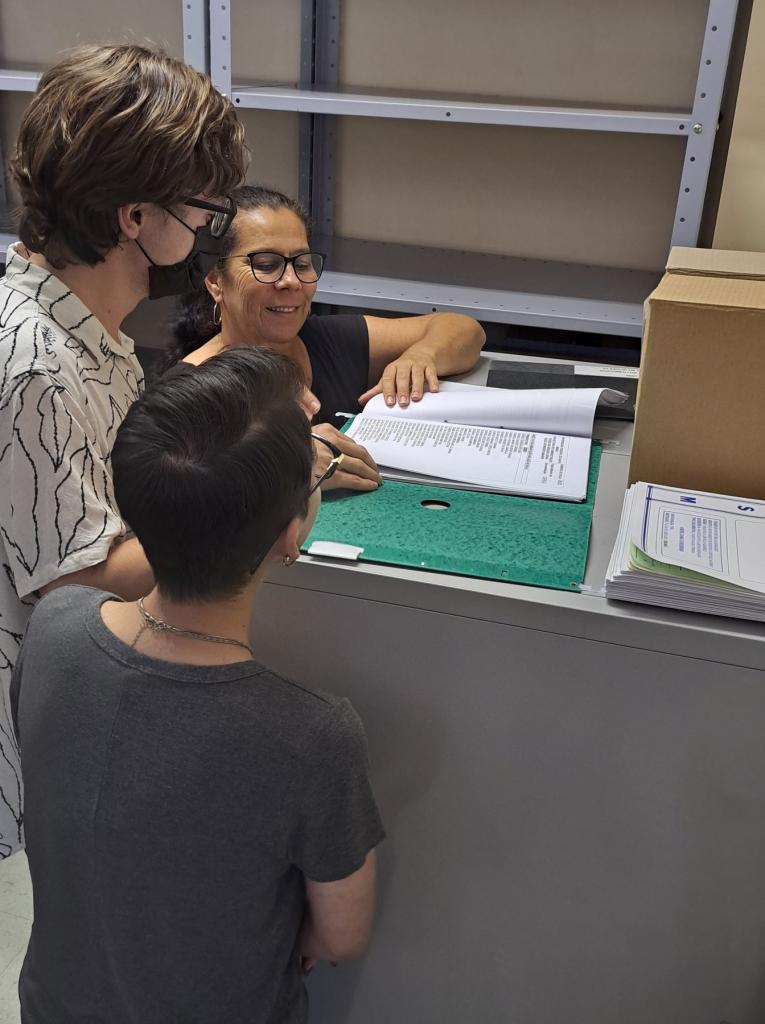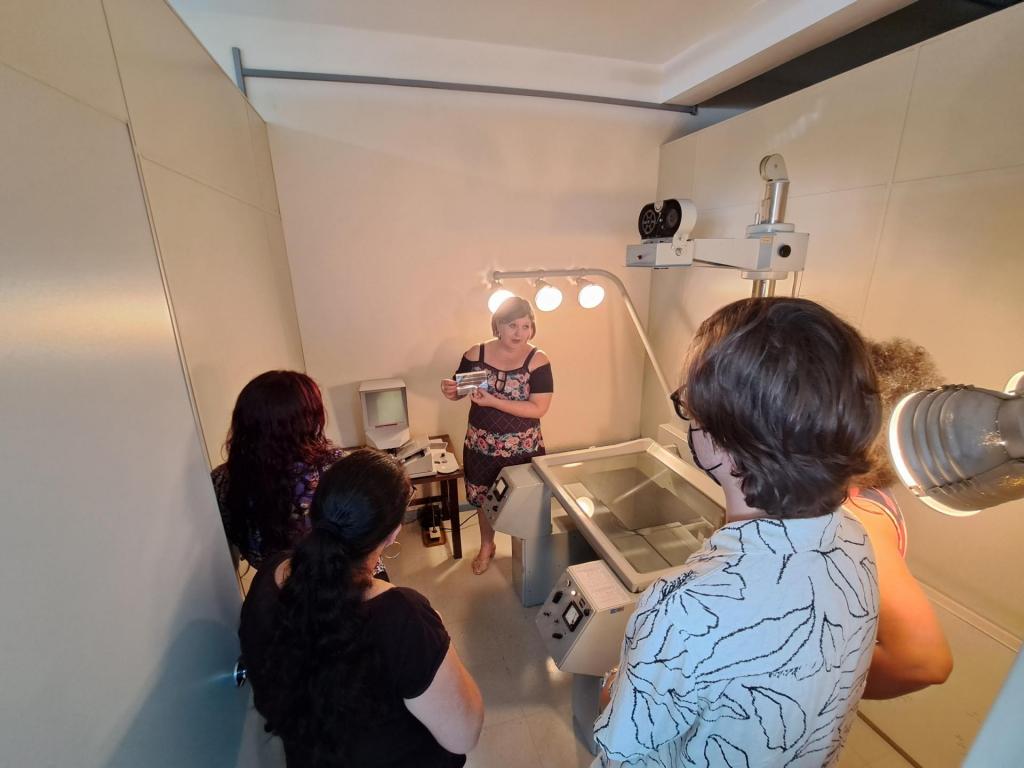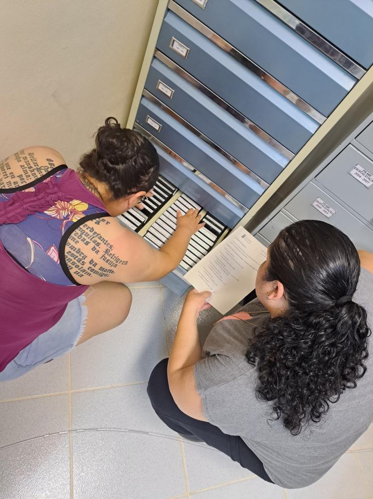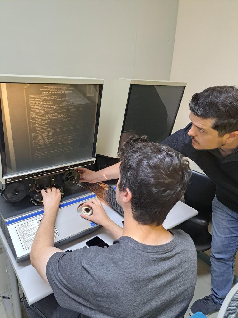 A seguir, os alunos realizaram atividades de preparação de documentos, microfilmagem com uso da Microfilmadora planetária Seleconta modelo Fill Master, pesquisa de dossiê de aluno formado de graduação, atendimento a pesquisadores com uso da leitora digitalizadora de microfilmes, produção de jaquetas e visualização do processo de limpeza de rolo de microfilme na Processadora Prostar.