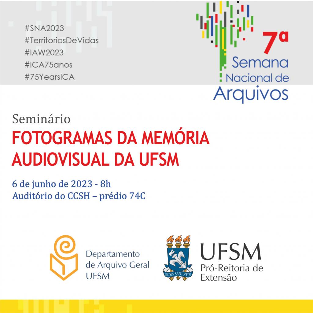 No contexto da importância do acervo audiovisual da UFSM para a história santa-mariense e como patrimônio documental; e para integrar a programação da 7ª Semana Nacional de Arquivo cujo tema é “ARQUIVOS – TERRITÓRIOS DE VIDAS”, o Departamento de Arquivo Geral e a Pró-Reitoria de Extensão promovem, na manhã de 06 de junho de 2023, no auditório do CCSH – prédio 74C, o Seminário Fotogramas da Memória Audiovisual da UFSM.