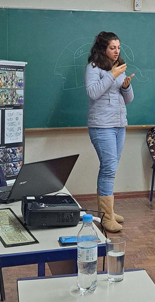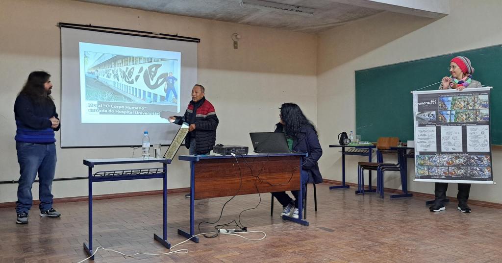 No primeiro encontro aconteceu uma palestra sobre muralismo ministrada por Juan Amoretti, artista e ex-professor da Universidade Federal de Santa Maria, abordando os processos de pintura de murais da universidade, em especial o “Mural O Corpo Humano”, localizado na fachada do Hospital Universitário de Santa Maria e criado em 1998 e o mural “Quinhentos Anos da Invasão da América”, localizado na fachada do Teatro Caixa Preta – Espaço Rozane Cardoso do Centro de Artes e Letras e criado em 1992.