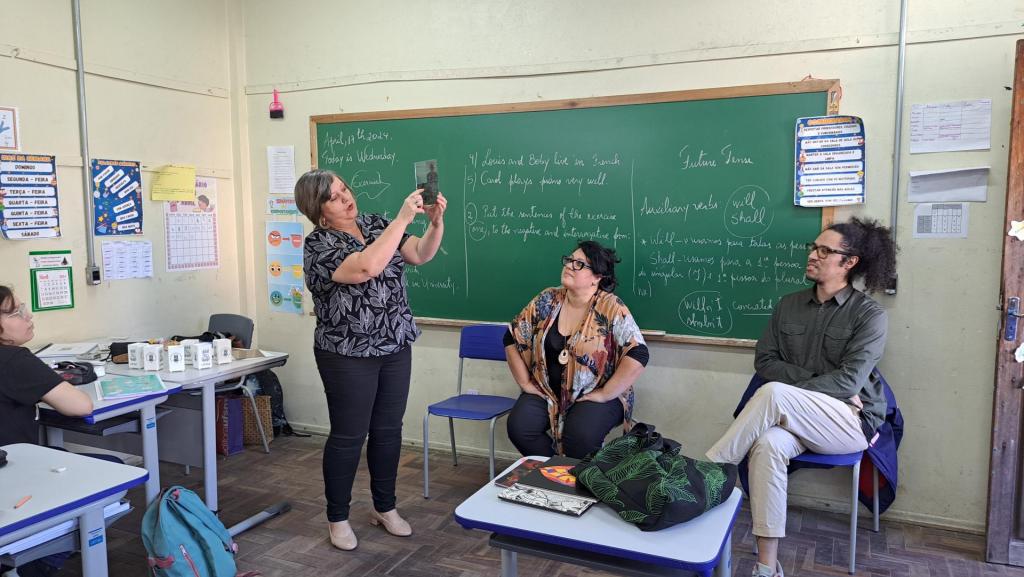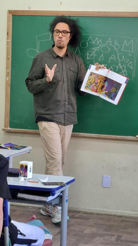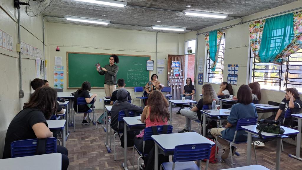 Iniciou na tarde de quarta-feira, 17 de abril, a quinta oficina de muralismo, inserida no projeto de extensão “Murais da UFSM: Interlocuções sobre Arte, Cultura e Patrimônio”, para 17 alunos do 8º ano ensino fundamental da Escola Municipal de Ensino Fundamental Dom Antonio Reis. A atividade será realizada no horário da disciplina de Arte, ministrada pela professora Jaqueline Both.