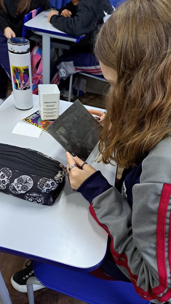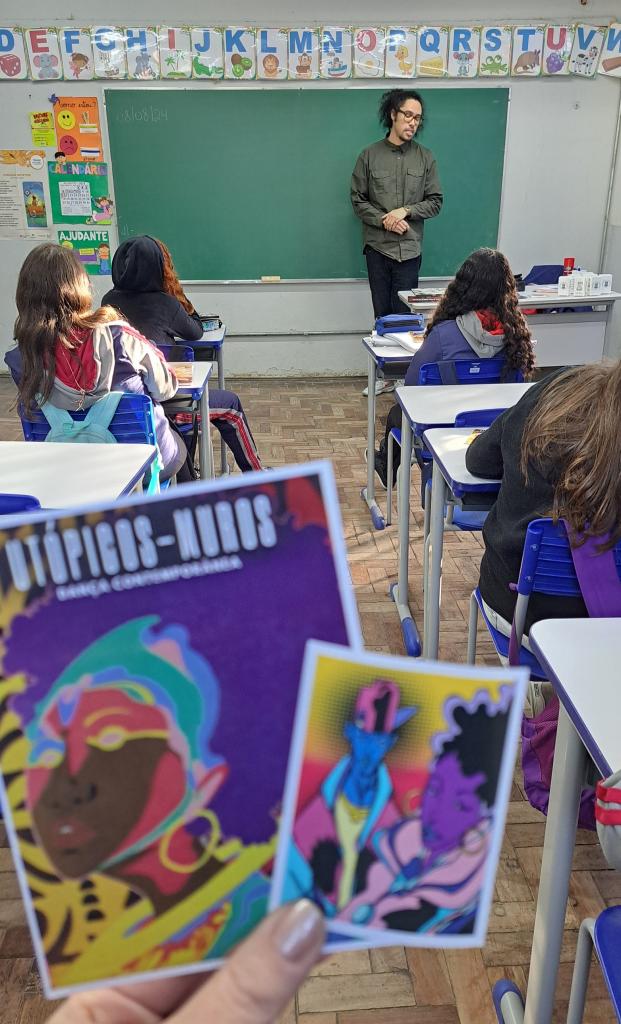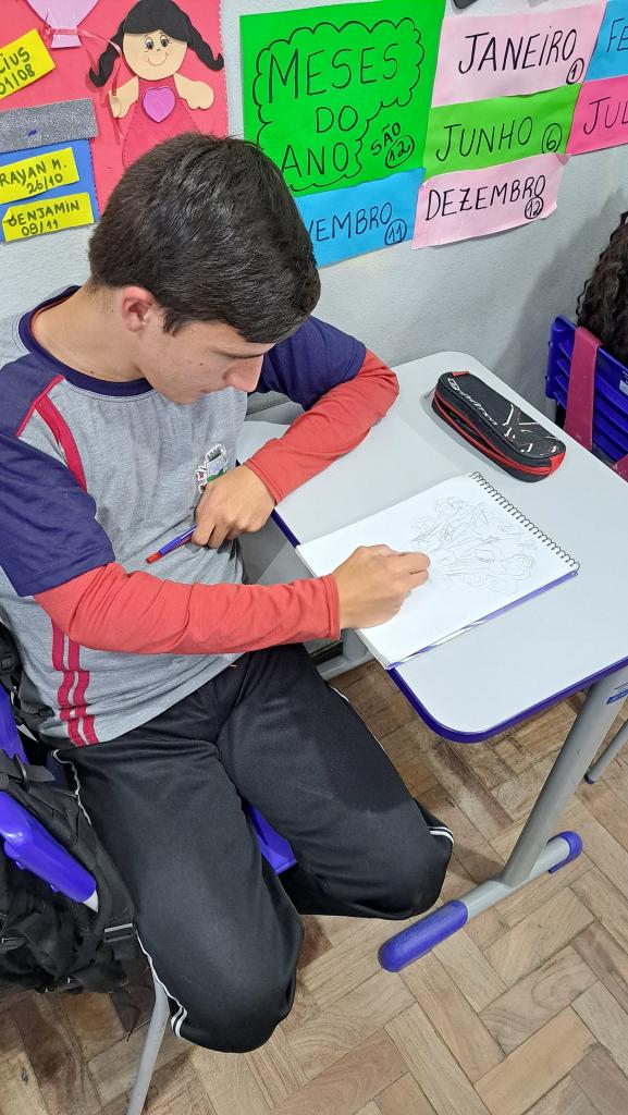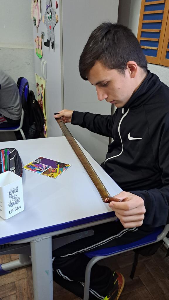 Na tarde de 08 de agosto o artista Braziliano falou sobre muralismo para os alunos do 9º ano do ensino fundamental da Escola Municipal de Ensino Fundamental Lourenço Dalla Corte, no Bairro São José, iniciando assim a sexta oficina do Projeto de Extensão “Murais da UFSM: Interlocuções sobre Arte, Cultura e Patrimônio”. O artista abordou o mural “O Machado Esquece; a Árvore Recorda” inaugurado em 2022 no hall do prédio 74C, do Centro de Ciências Sociais e Humanas (CCSH), cujo temática é o combate ao racismo.
