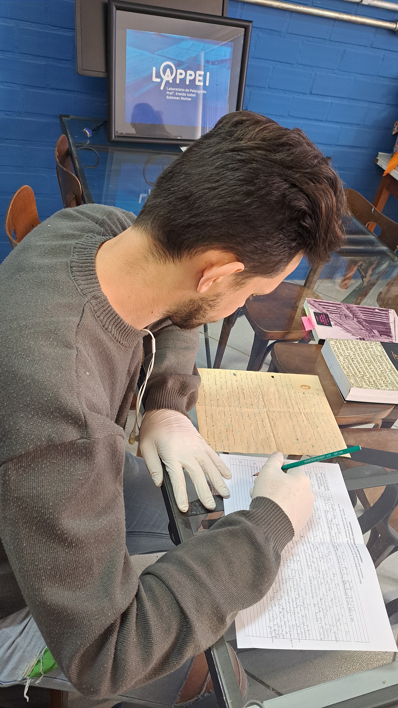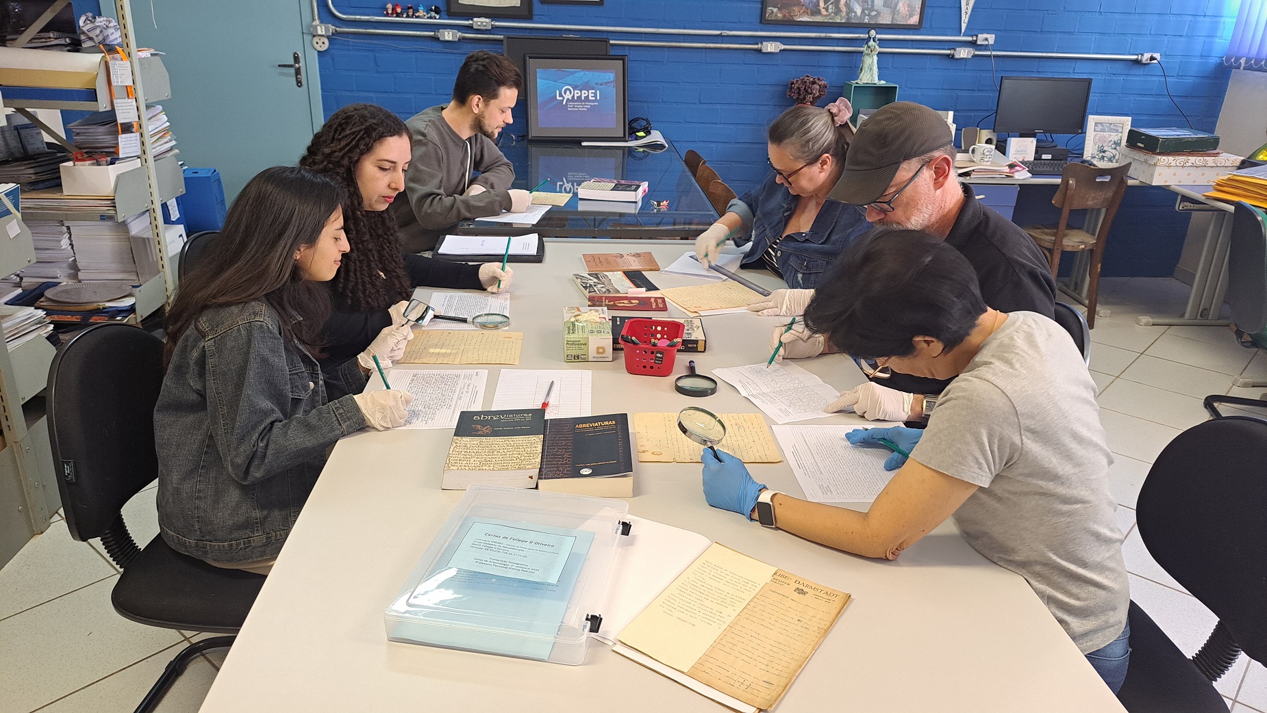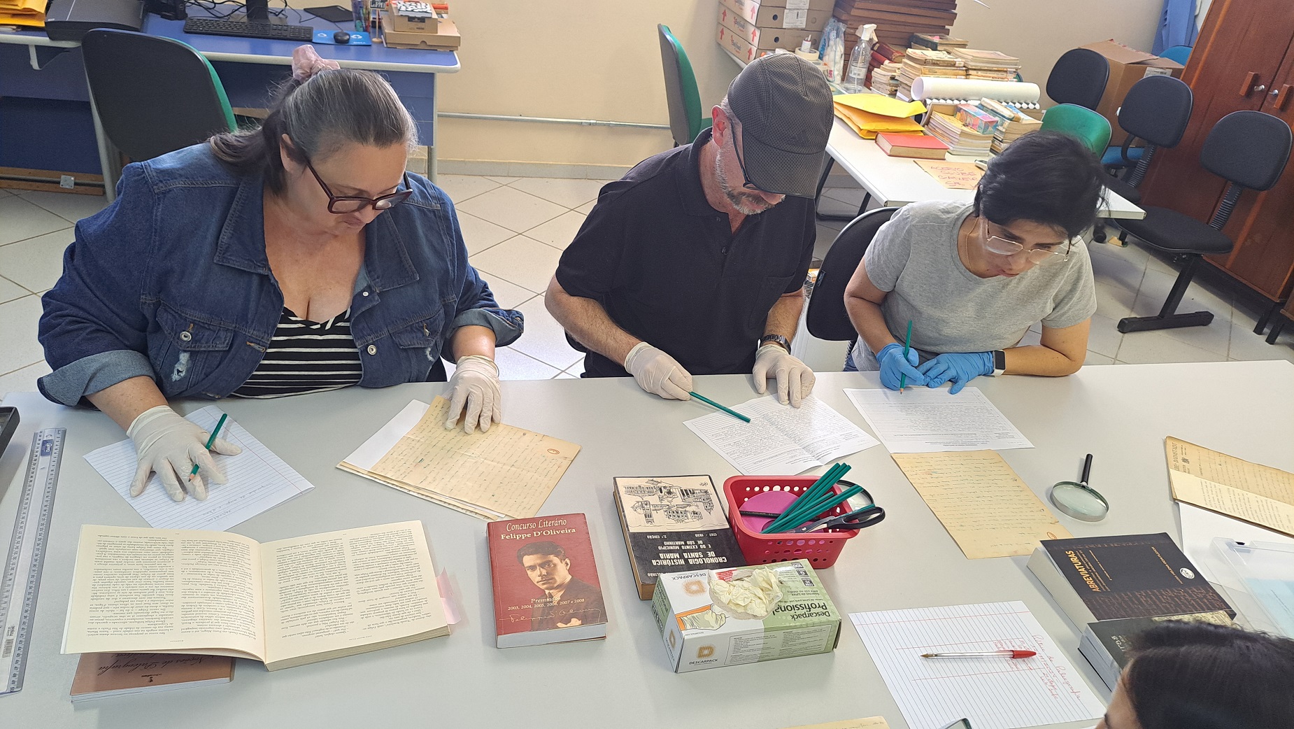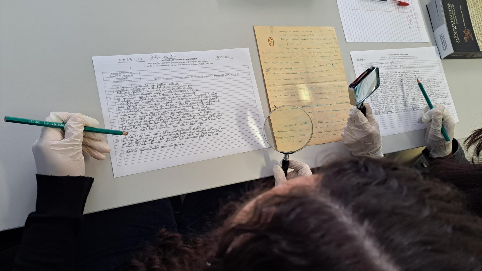 Os acadêmicos Rodrigo Bredow Bock, Manoela Nunes Lopes, Luize Gabrielle Aguilar Vargas, Fernando Leipnitz e Carla Corrêa do quarto semestre do Curso de Graduação em Arquivologia da Universidade Federal de Santa Maria estão realizando a transcrição paleográfica de cartas dos anos de 1916 e 1924 do dossiê de Felippe D’Oliveira.