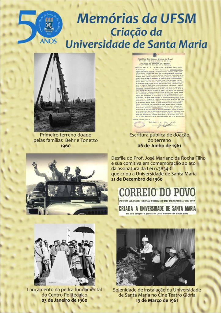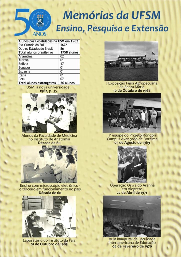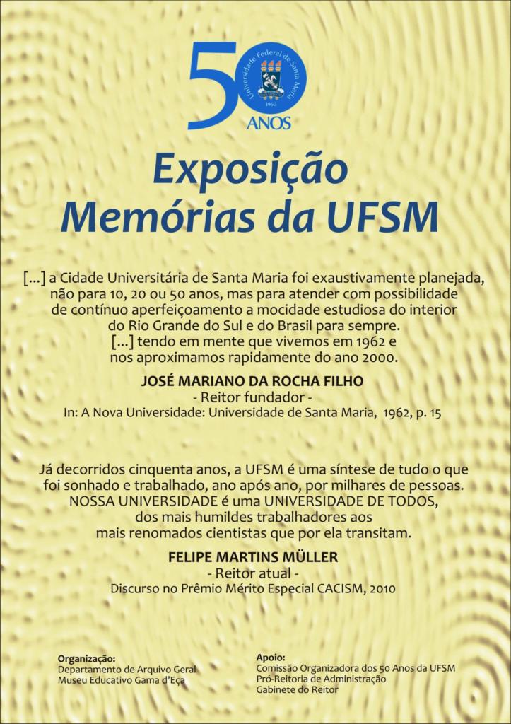 Como uma das atividades alusivas as comemorações dos 50 anos da Universidade, o Departamento de Arquivo Geral e o Museu Educativo Gama d”Eça organizaram a Exposição Memórias da UFSM, retratando uma parte de sua história: a criação e instalação; as primeiras obras; a construção do campus universitário; as marcas e símbolos; as atividades de ensino, pesquisa e extensão; e seus dirigentes.